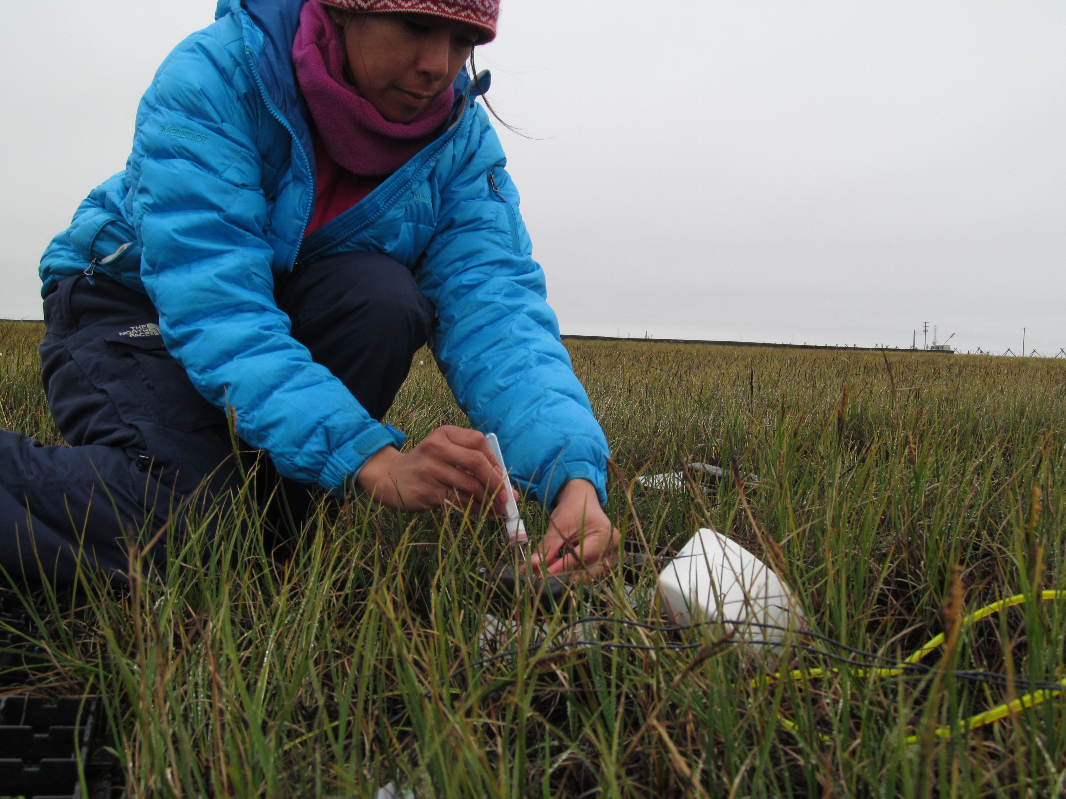 Cristina Solis: "Vials are filled by puncturing the resealable membrane on the top of each tube with a thin needle which is connected to slender tube inserted down into the soil. Although these tubes are small, they fill slowly, sometimes taking an hour to fill." Barrow, Alaska.