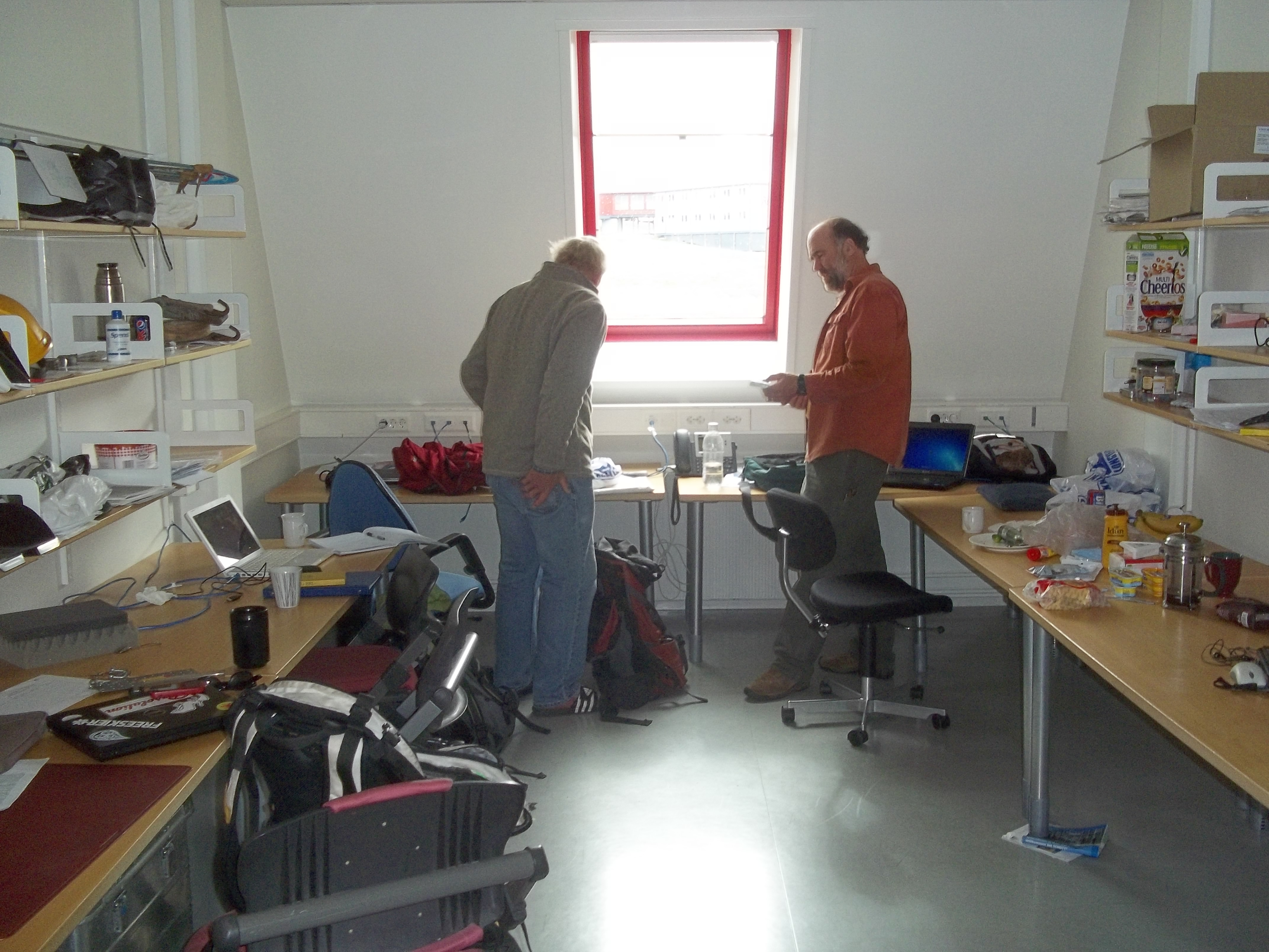 Mike Retelle and Steve Roof in the team's temporary office at UNIS (University Centre in Svalbard). UNIS, Longyearbyen, Svalbard.