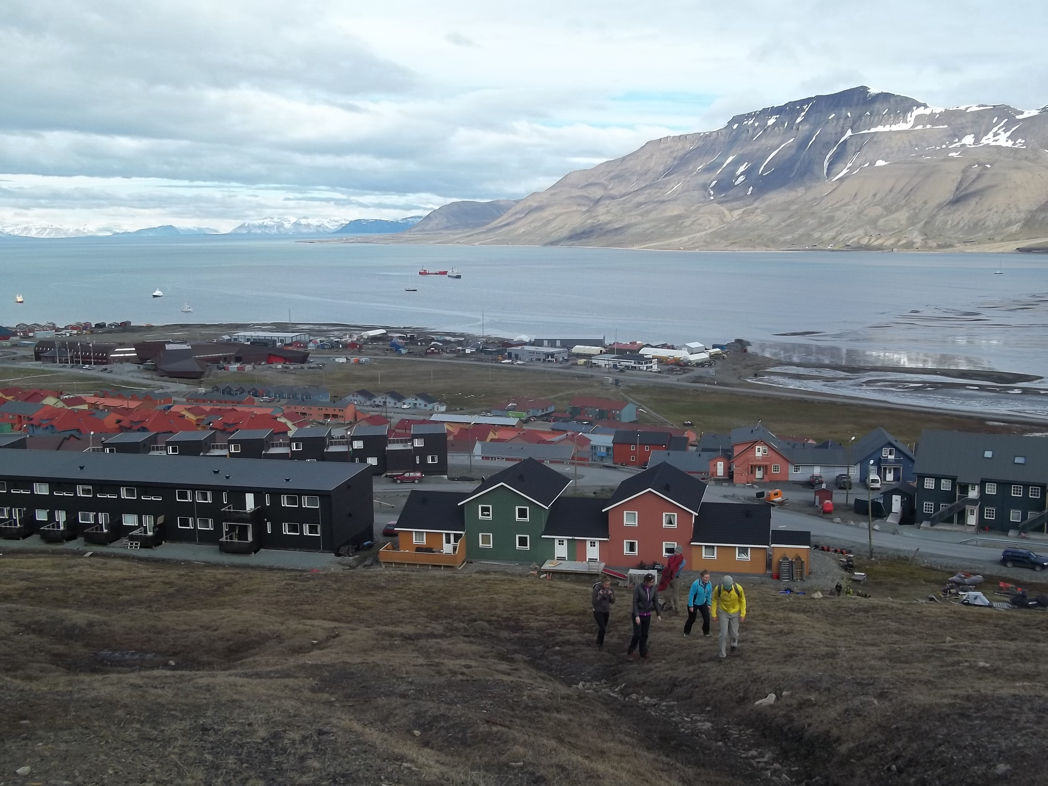 A view of Longyearbyen as the team heads up in elevation during a hike. Longyearbyen, Svalbard.