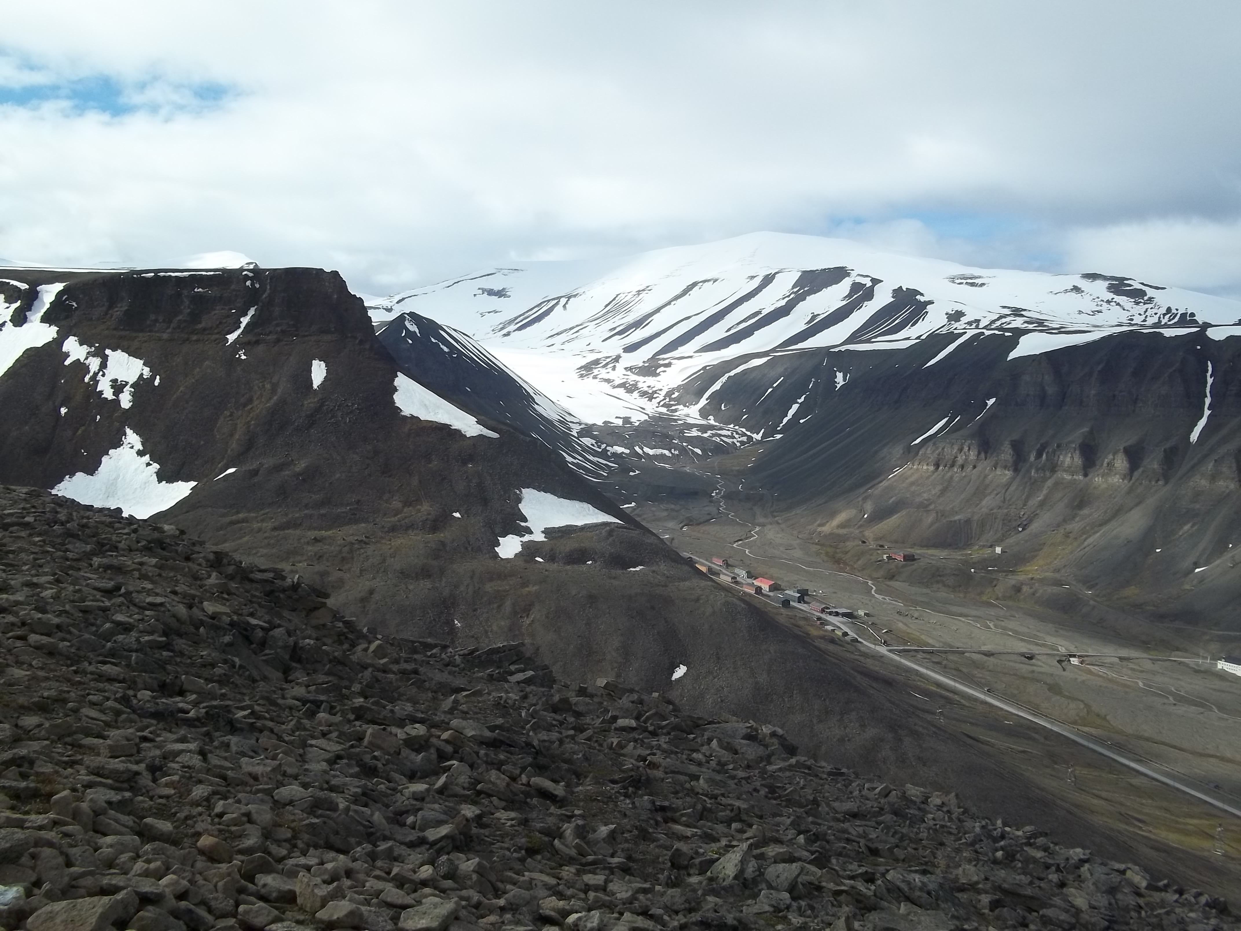 The view up the valley to Newbyen from on top of Sukkertoppen mountain. Longyearbyen, Svalbard.