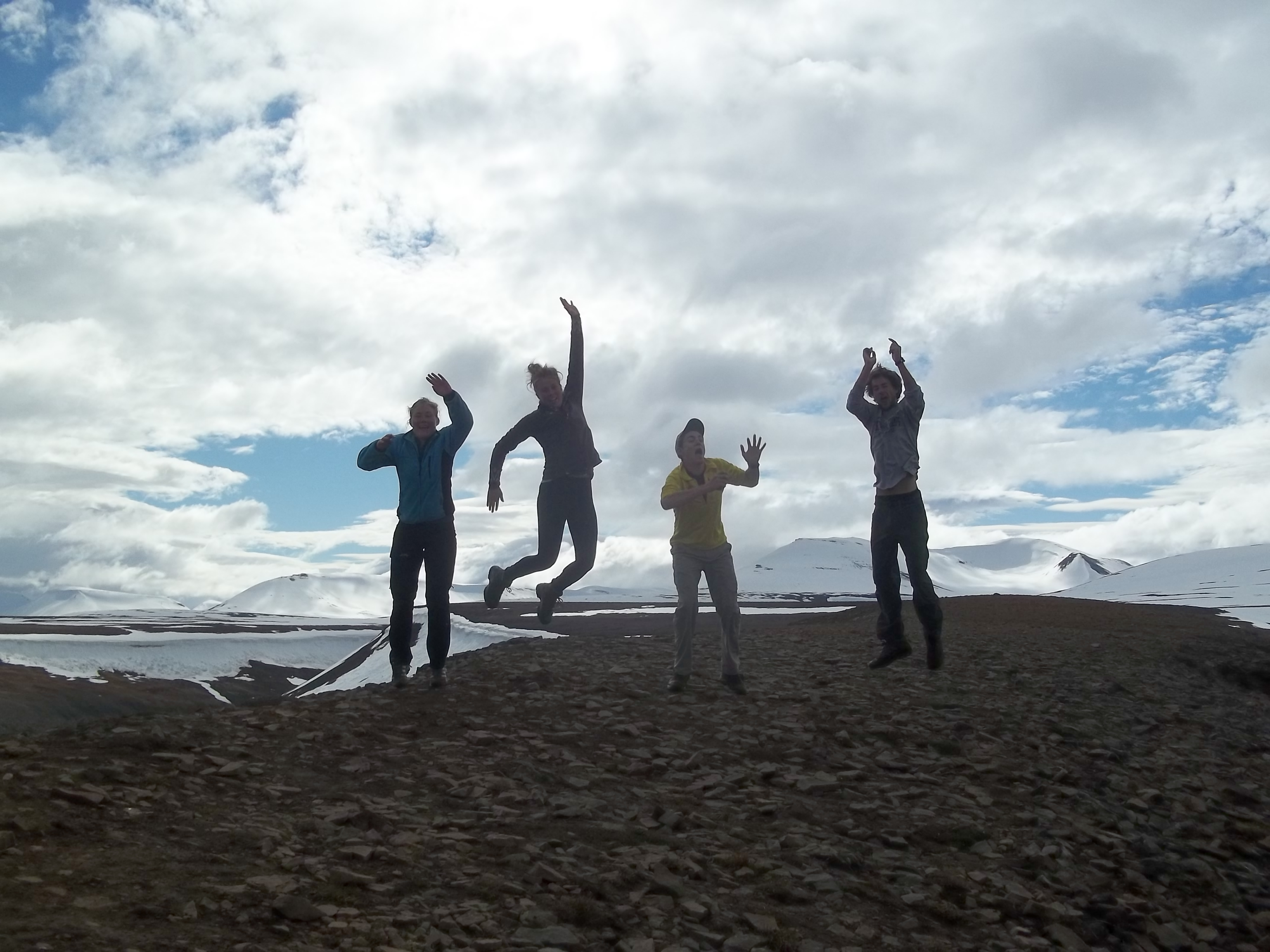 Students jump for the photo at high elevation above Longyearbyen. Longyearbyen, Svalbard.