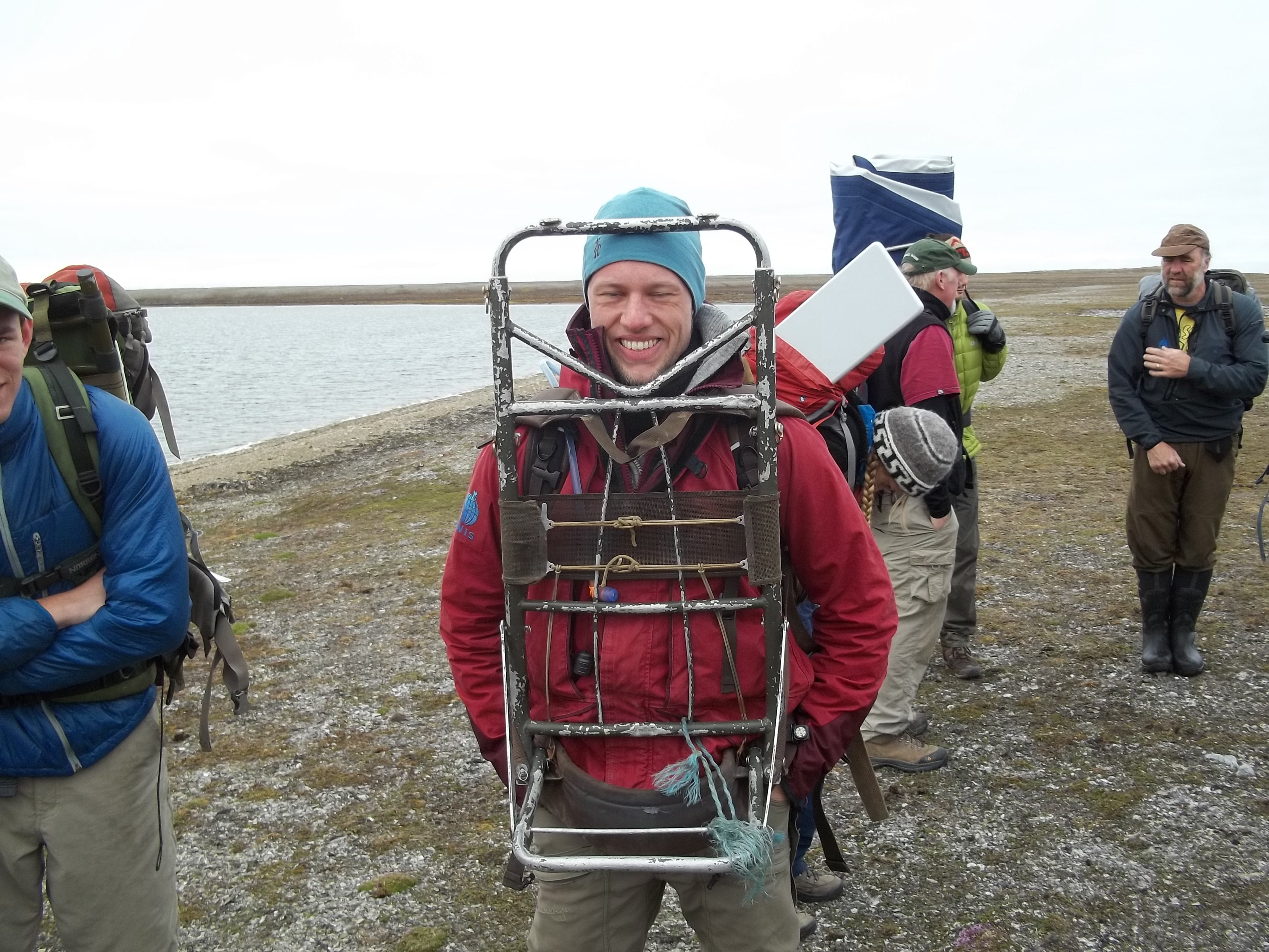 Lukas Glaw's newly unloaded frame pack, backwards. Isfjord Radio at Kapp Linne, Svalbard.