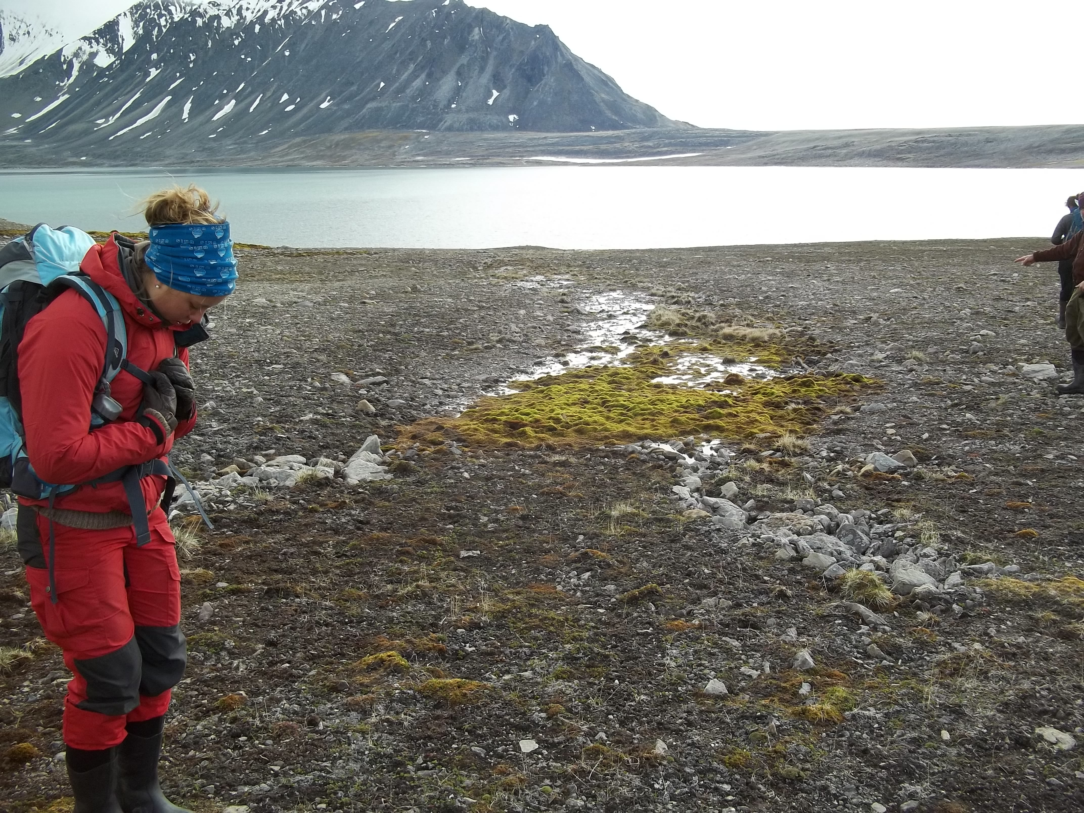 Two bands of stone clasts meet and drain the active layer. Isfjord Radio at Kapp Linne, Svalbard.