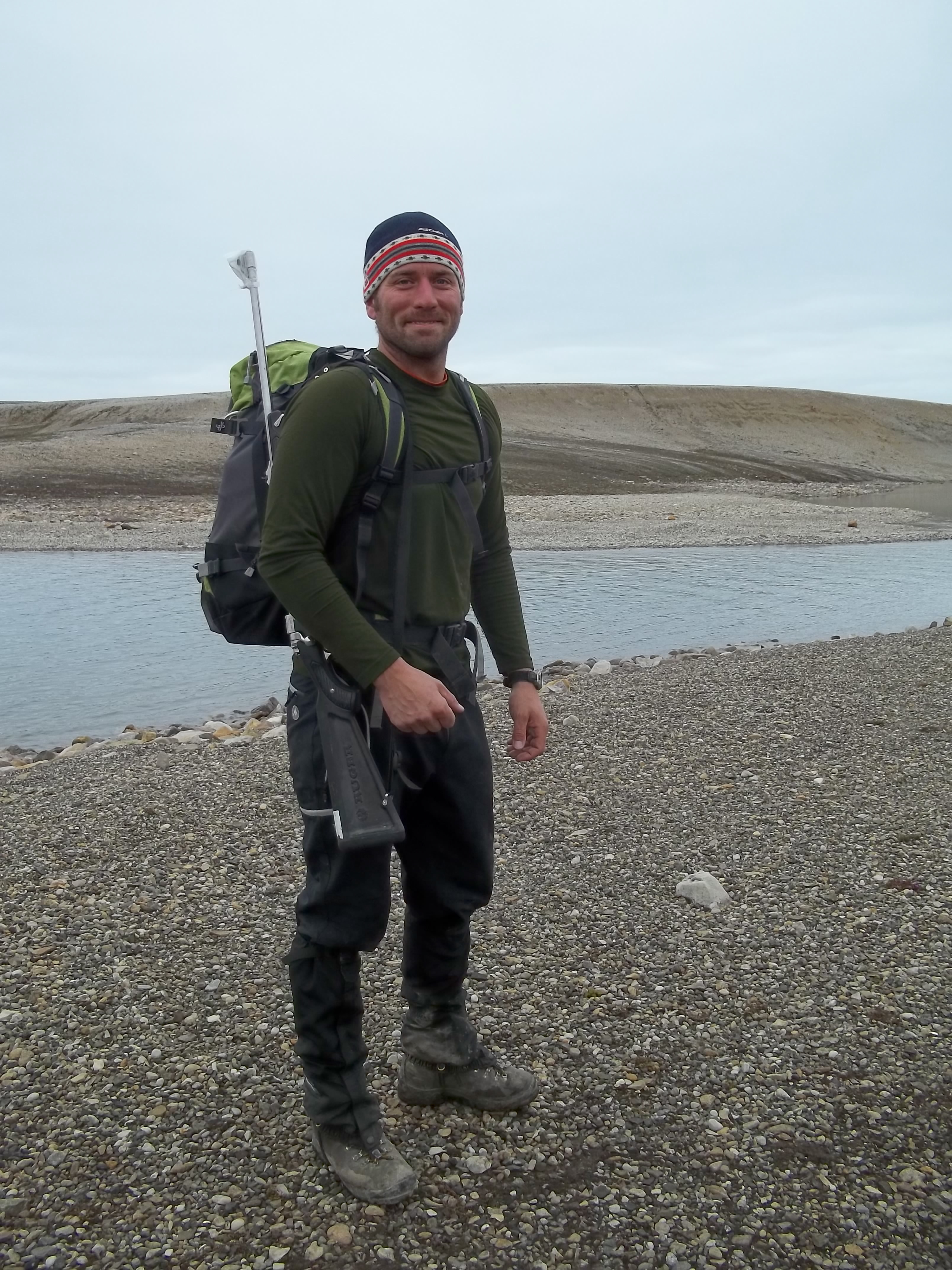 Dan Frost dons a typical day's field-wear. Isfjord Radio at Kapp Linne, Svalbard.