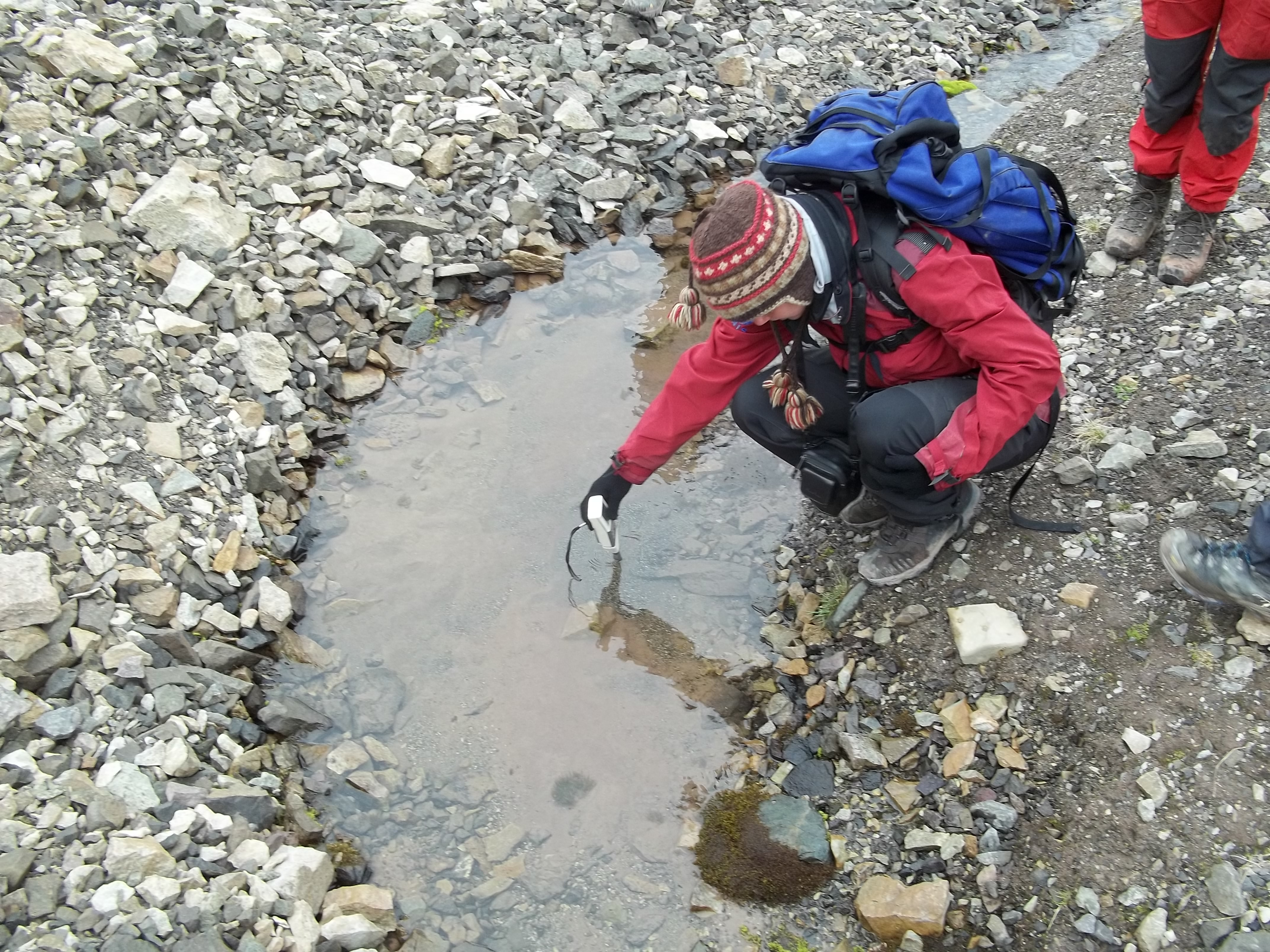 Dagmar Schou tests the conductivity of a karst spring. Isfjord Radio at Kapp Linne, Svalbard.
