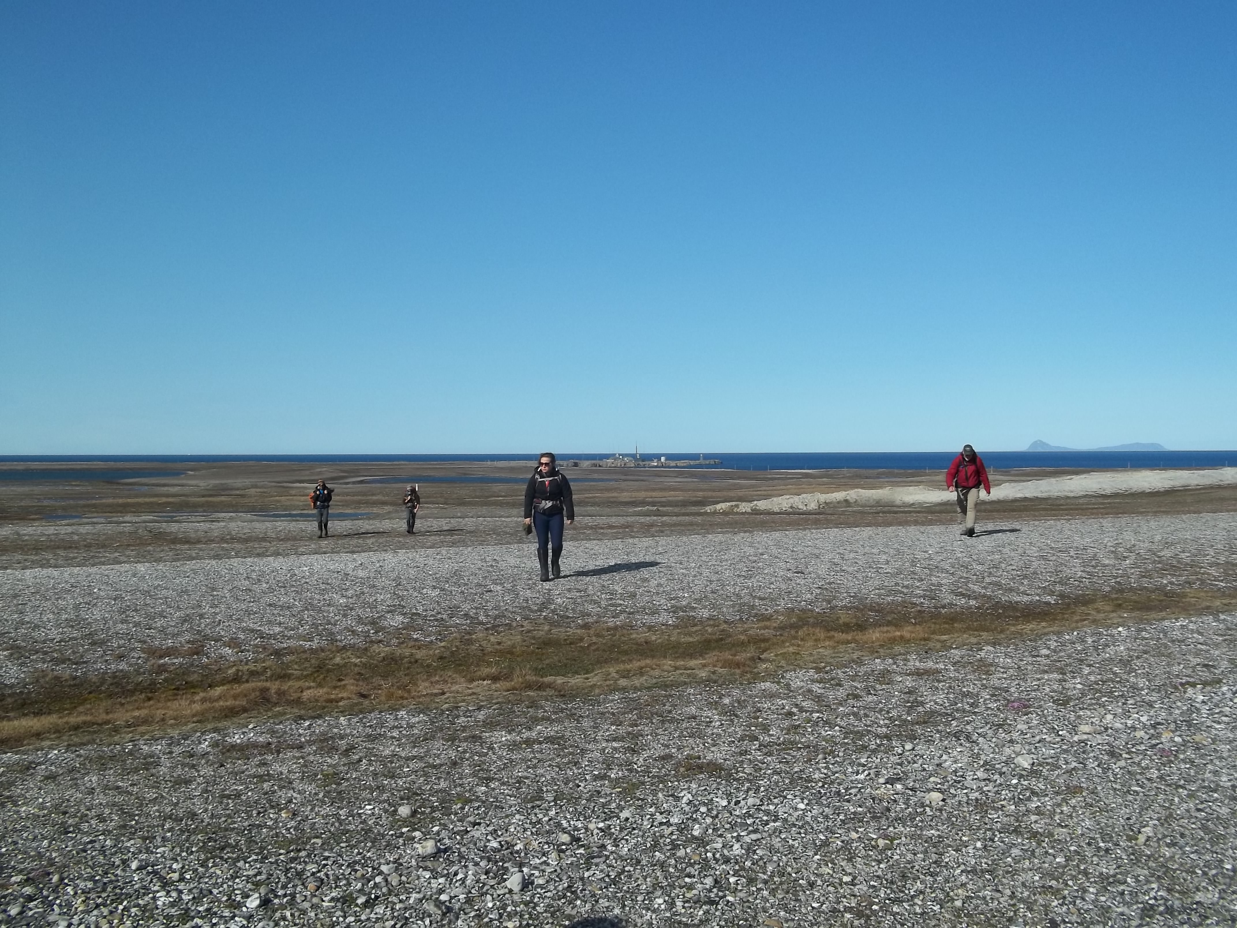 The team walks over the strandflat out to the field. Isfjord Radio at Kapp Linne, Svalbard.