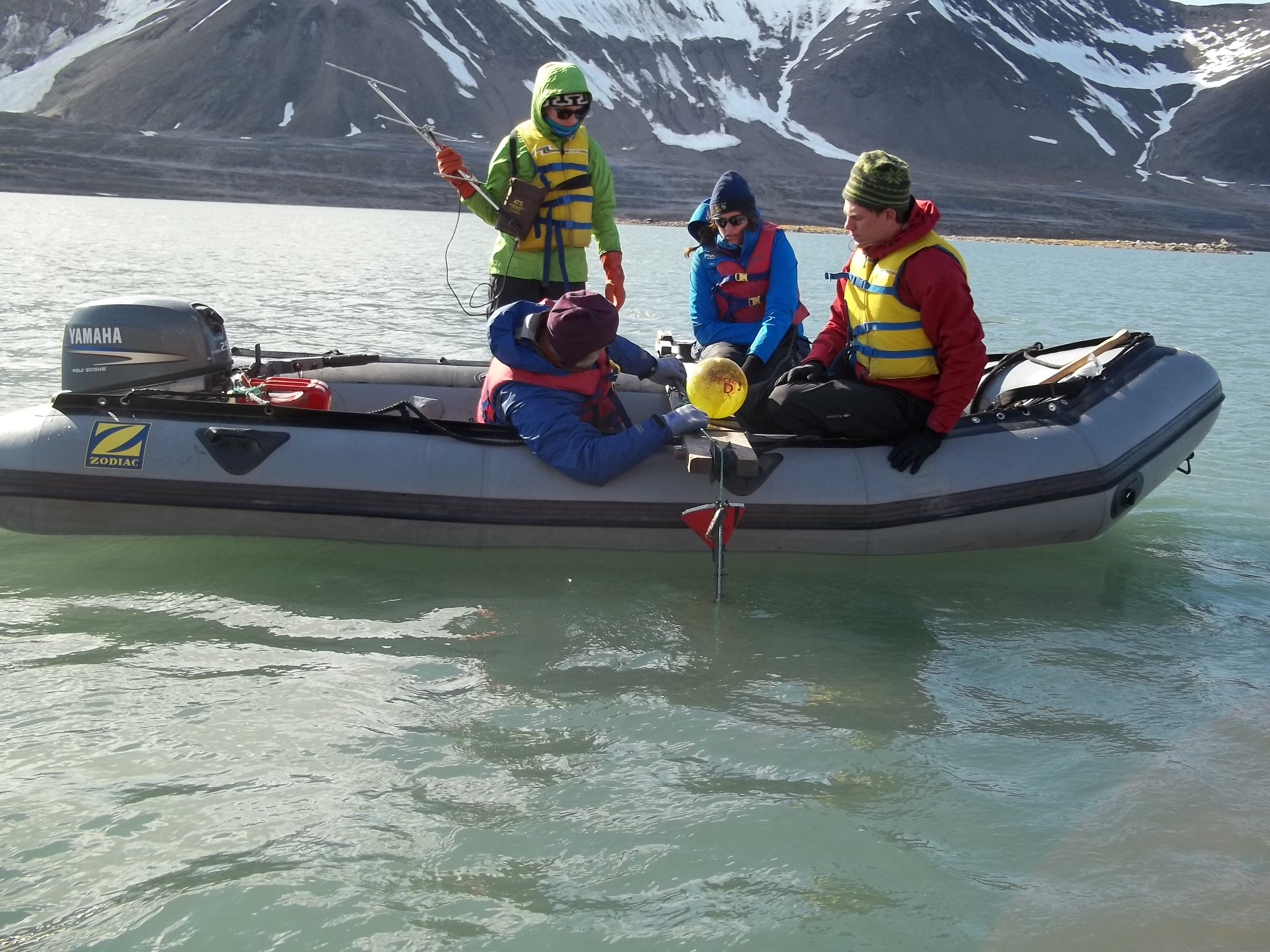 Steve Roof and students pull in a mooring on Linnevatnet. Isfjord Radio at Kapp Linne, Svalbard.
