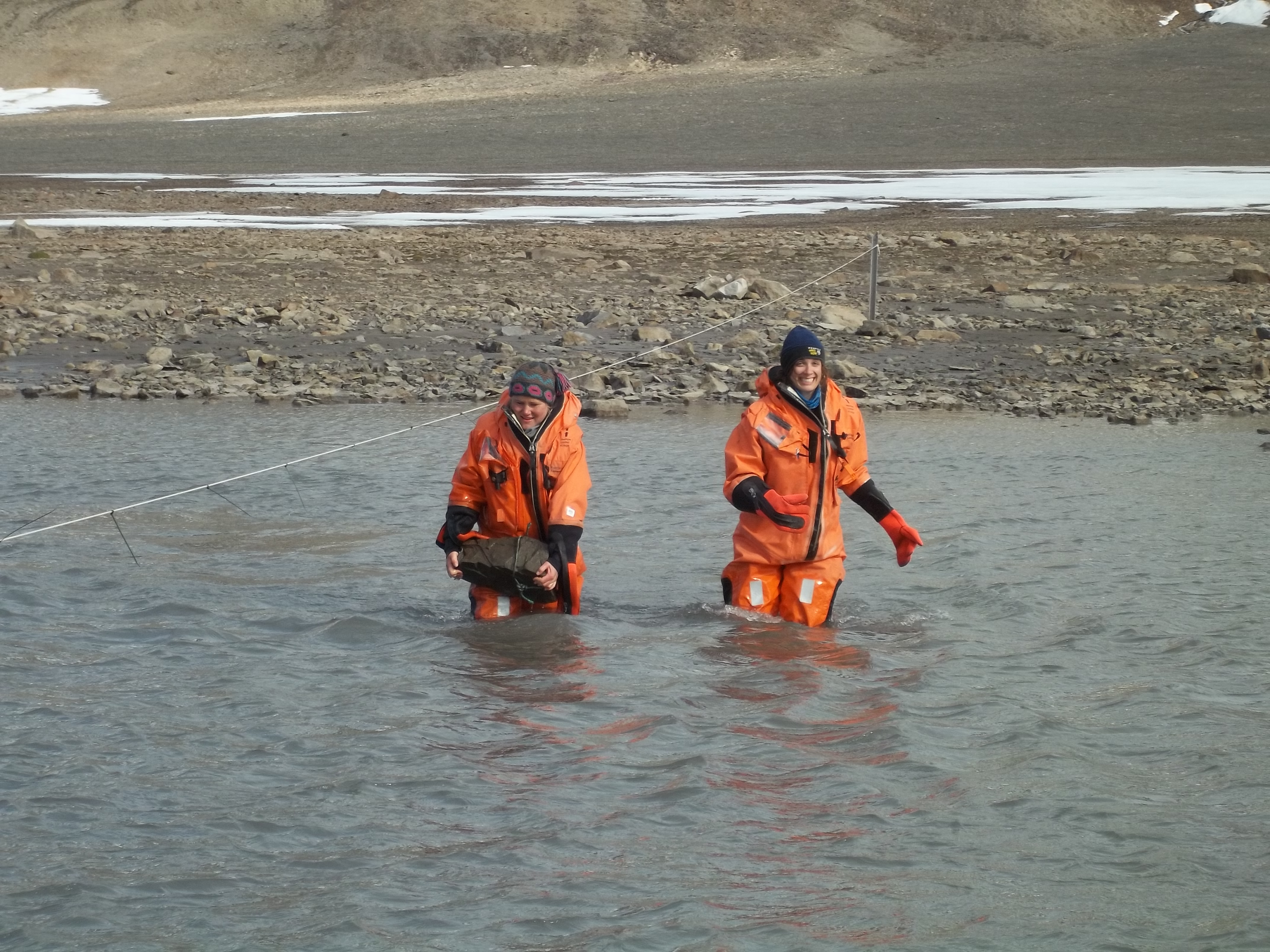 Elin Roalkvam retrieves a rock-anchored probe on Linneelva with Melissa Reusche. Isfjord Radio at Kapp Linne, Svalbard.