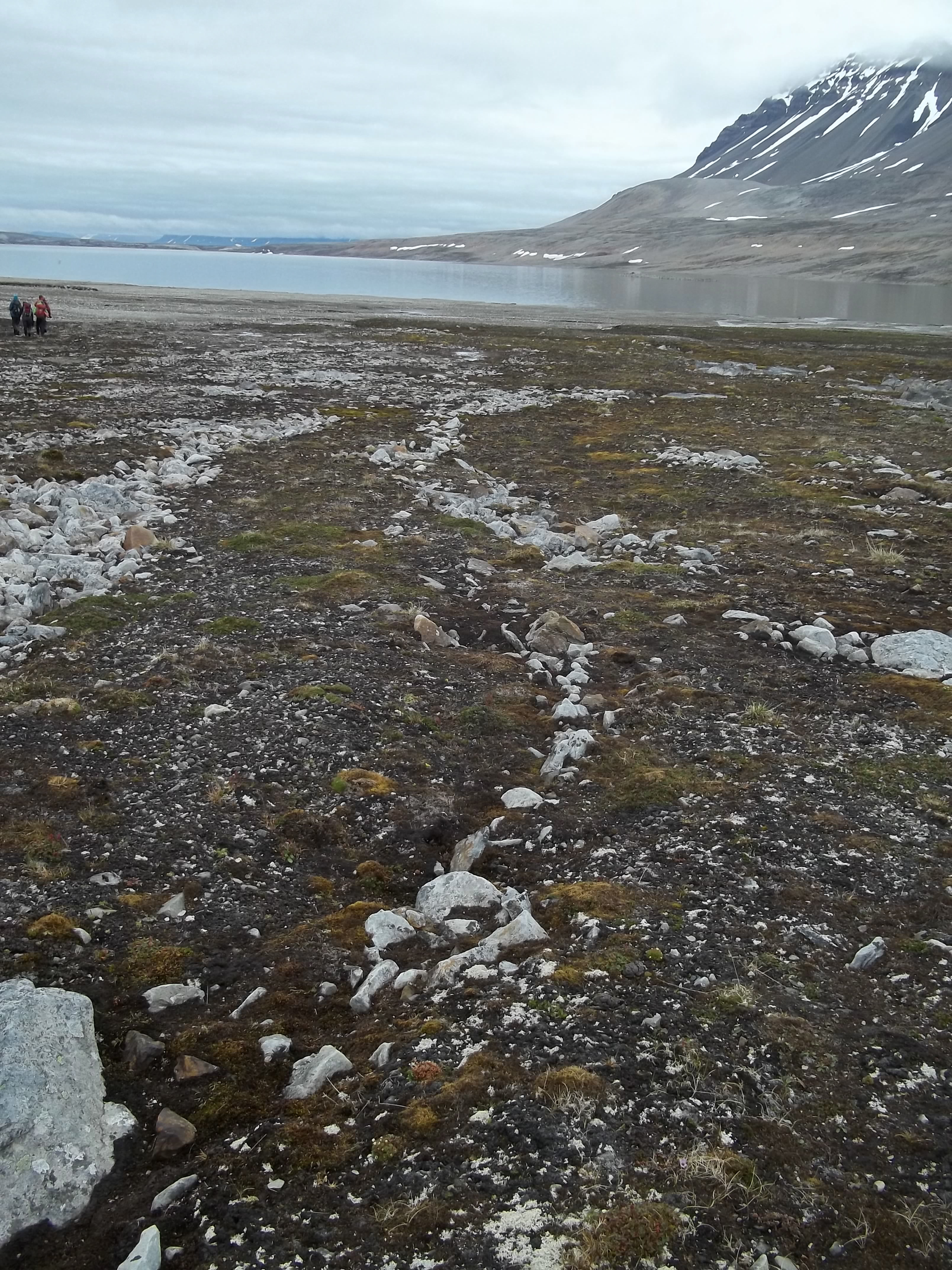 Stone stripes flow in the active layer down to Lake Linne. Isfjord Radio at Kapp Linne, Svalbard.