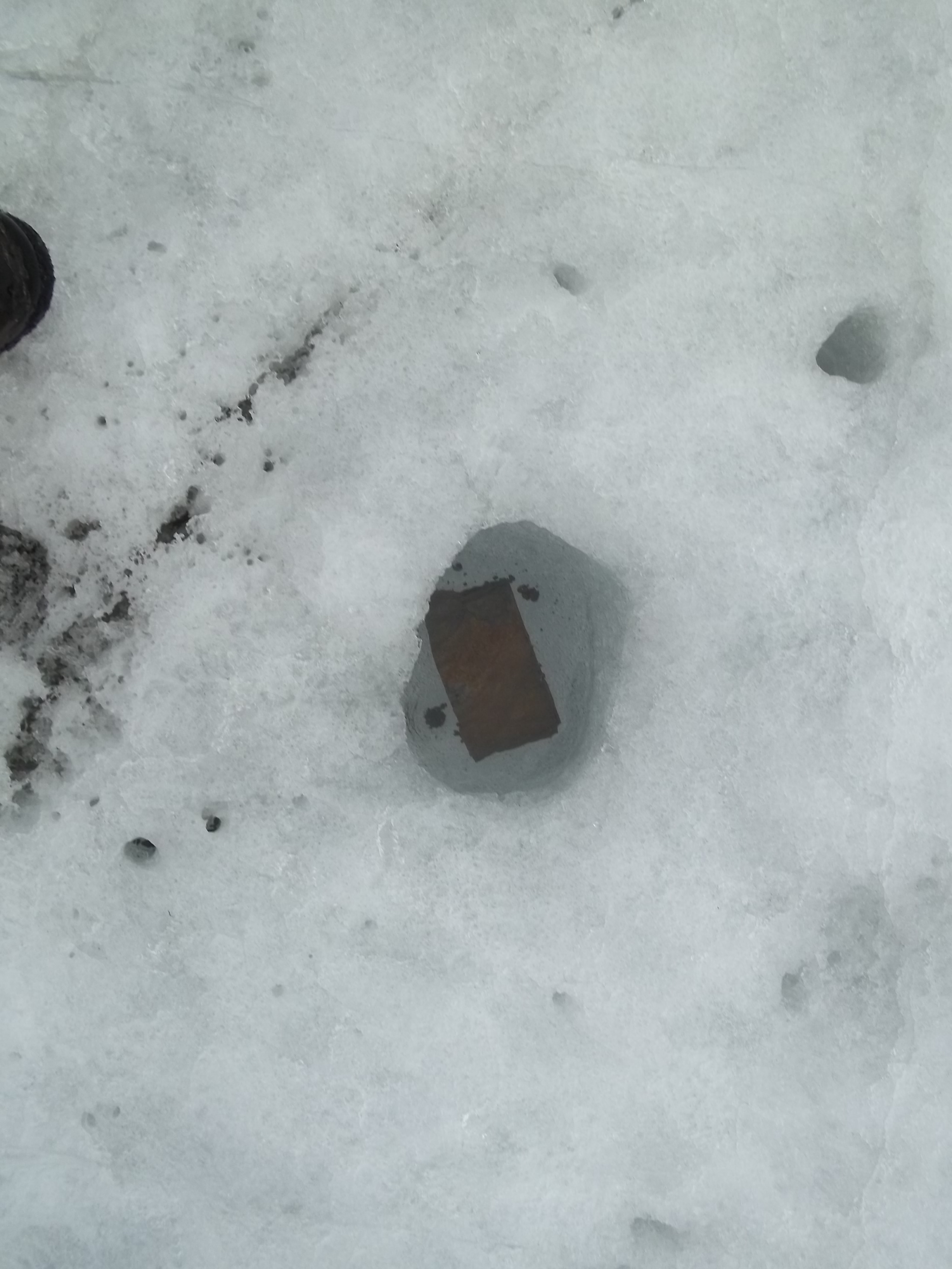 A stone that has attracted solar radiation to melt into the surface of the glacier. Isfjord Radio at Kapp Linne, Svalbard.