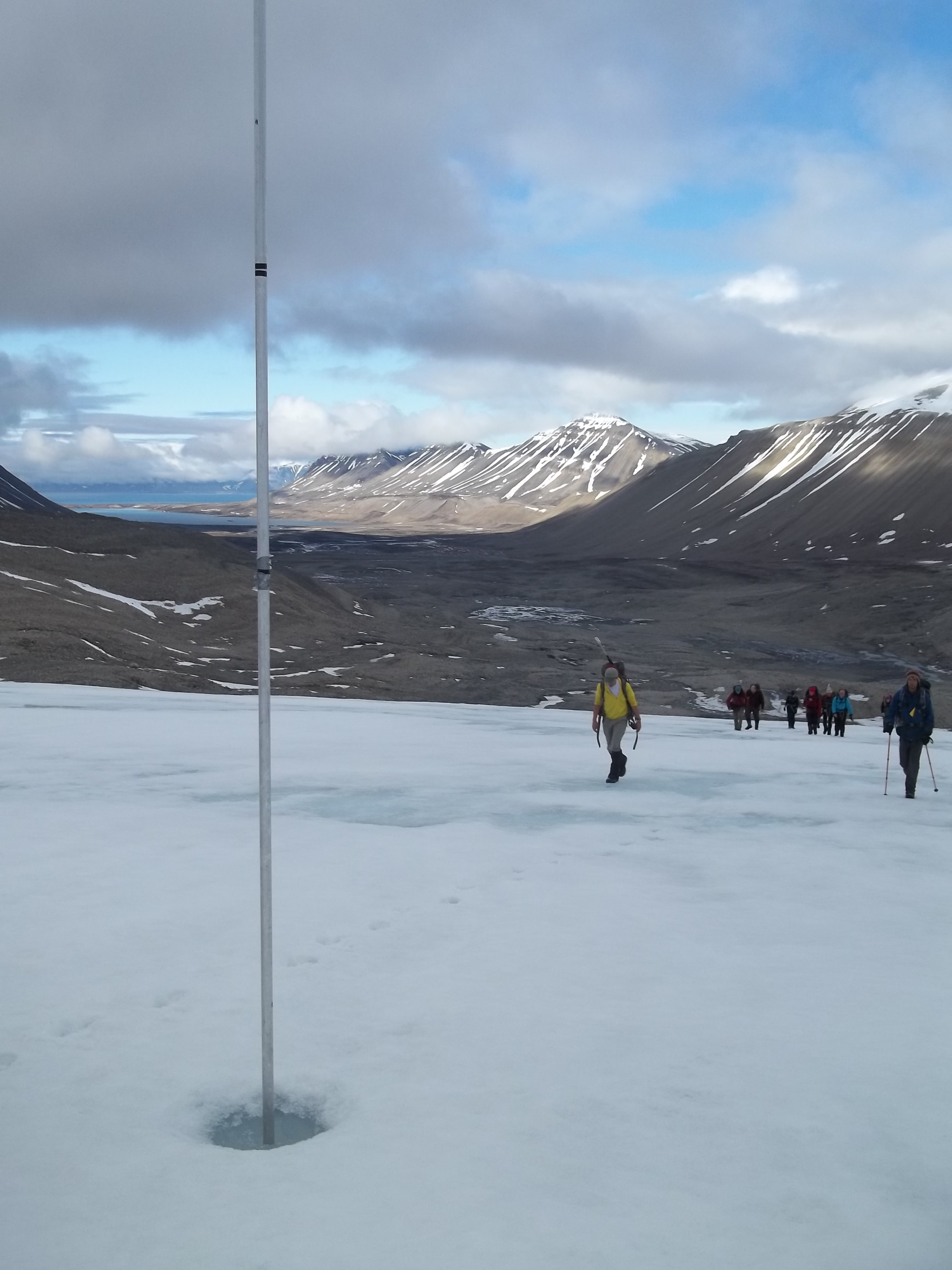The team hikes up to an ablation stake on Linnebreen. Isfjord Radio at Kapp Linne, Svalbard.