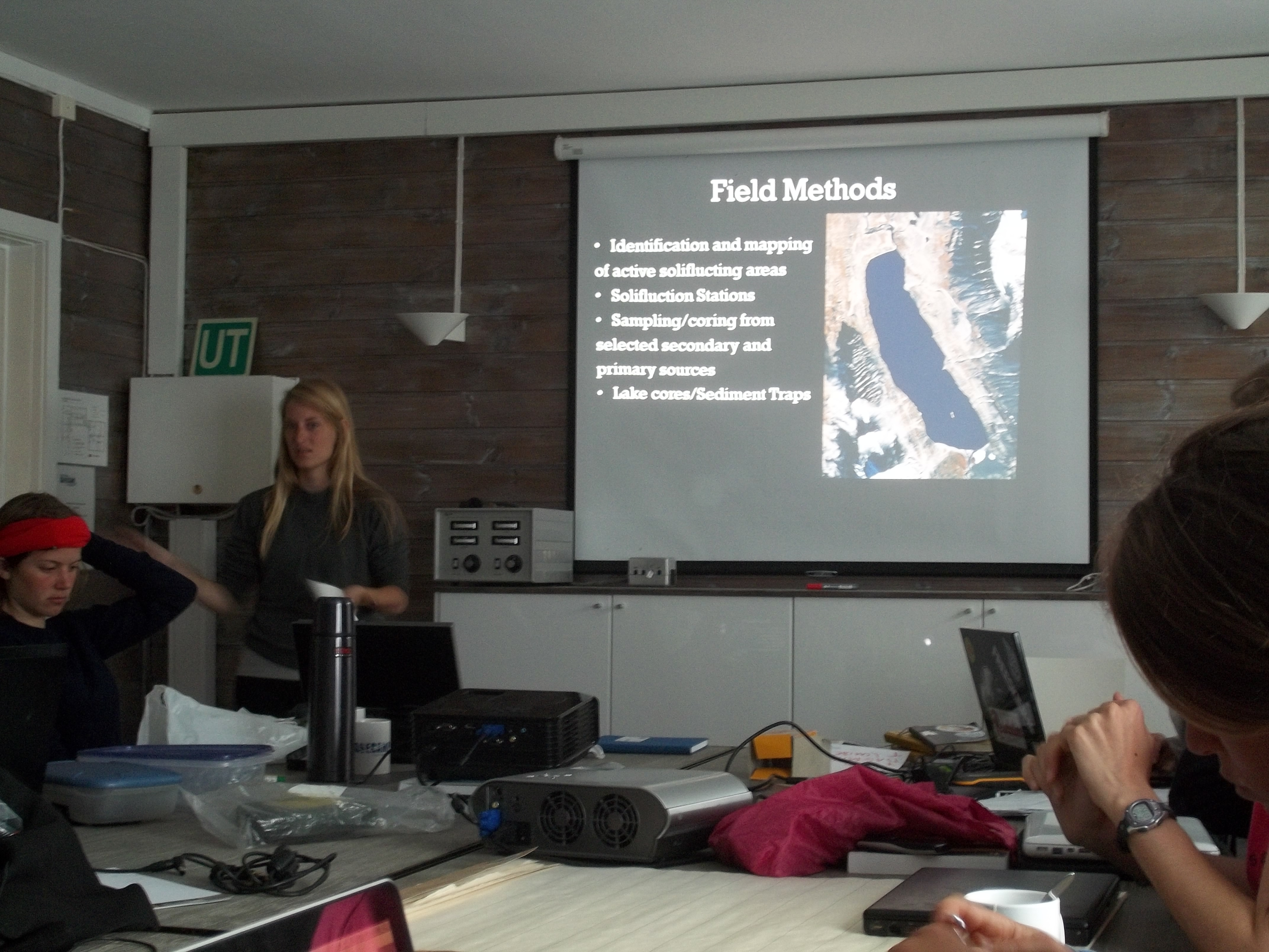 Helena Tiedmann gives a presentation on her thesis project in the conference room at Isfjord Radio. Isfjord Radio at Kapp Linne, Svalbard.
