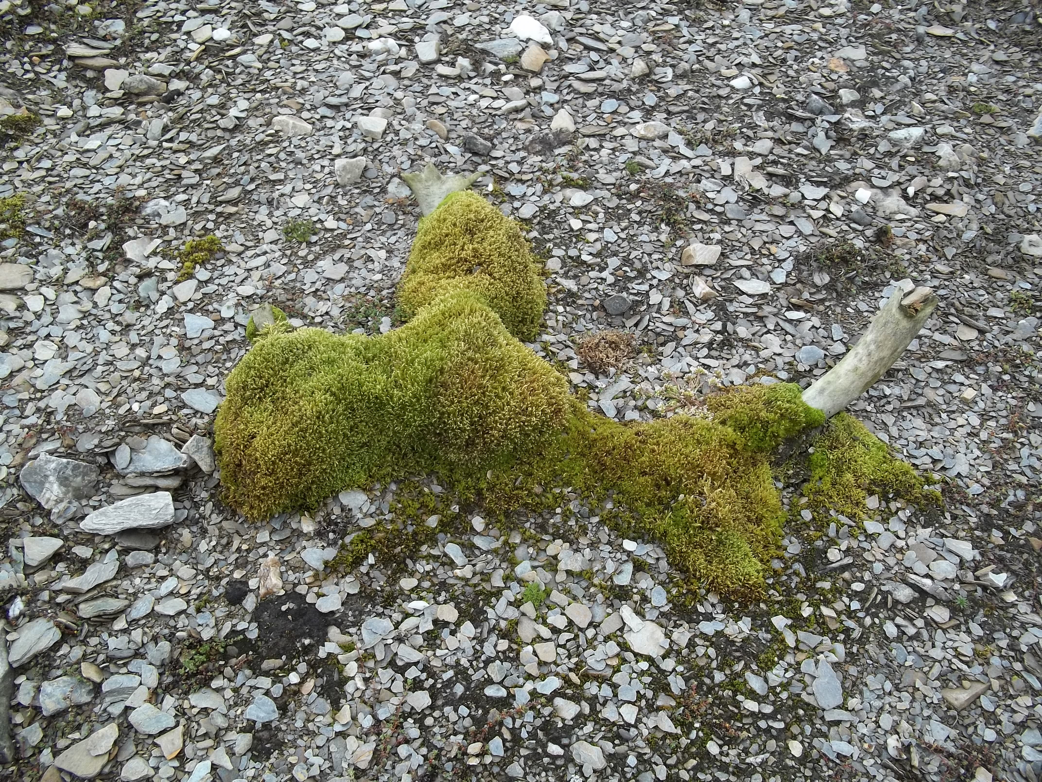 A moss covered reindeer antler on the south beach of Lake Linne. Isfjord Radio at Kapp Linne, Svalbard.