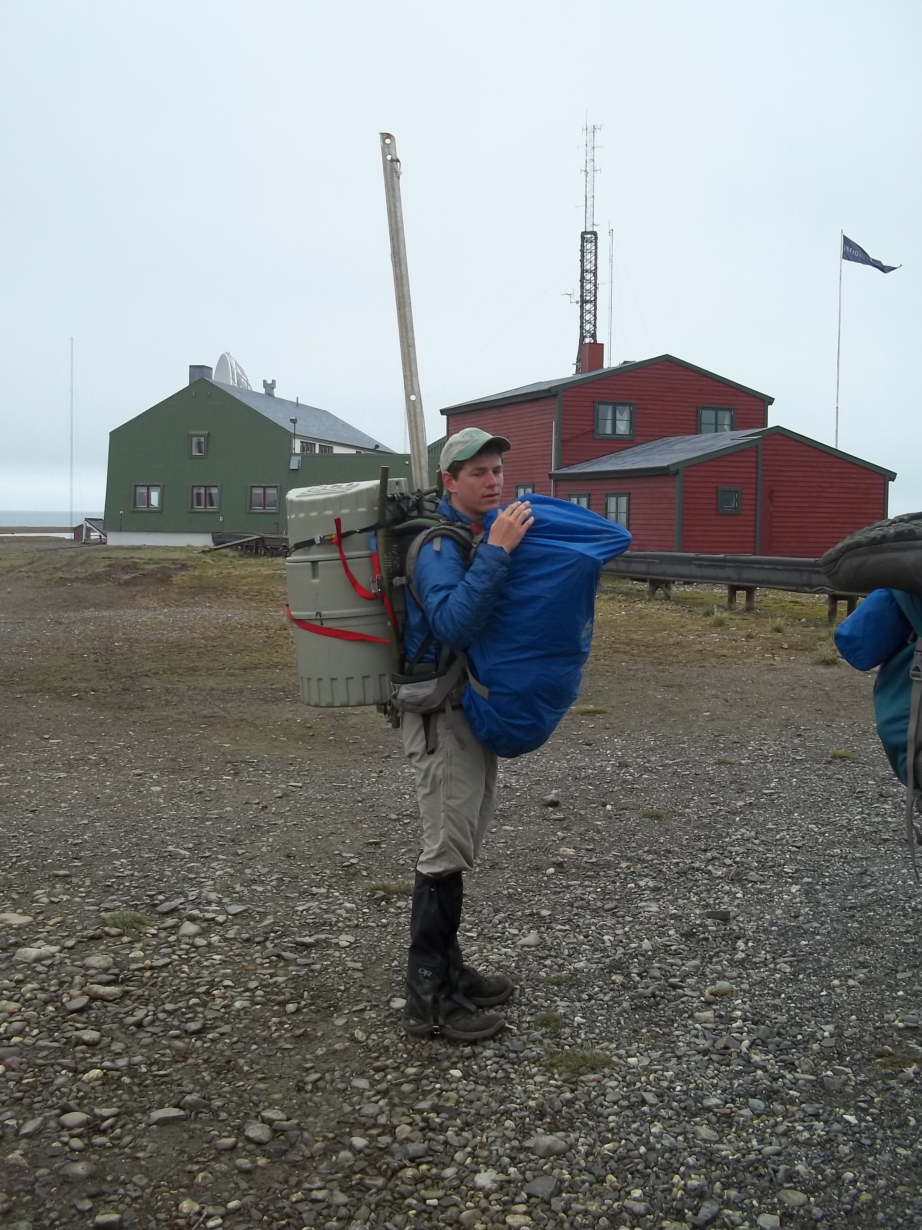 John Whiting is packed front and back for the trip to the glacier. Isfjord Radio at Kapp Linne, Svalbard.