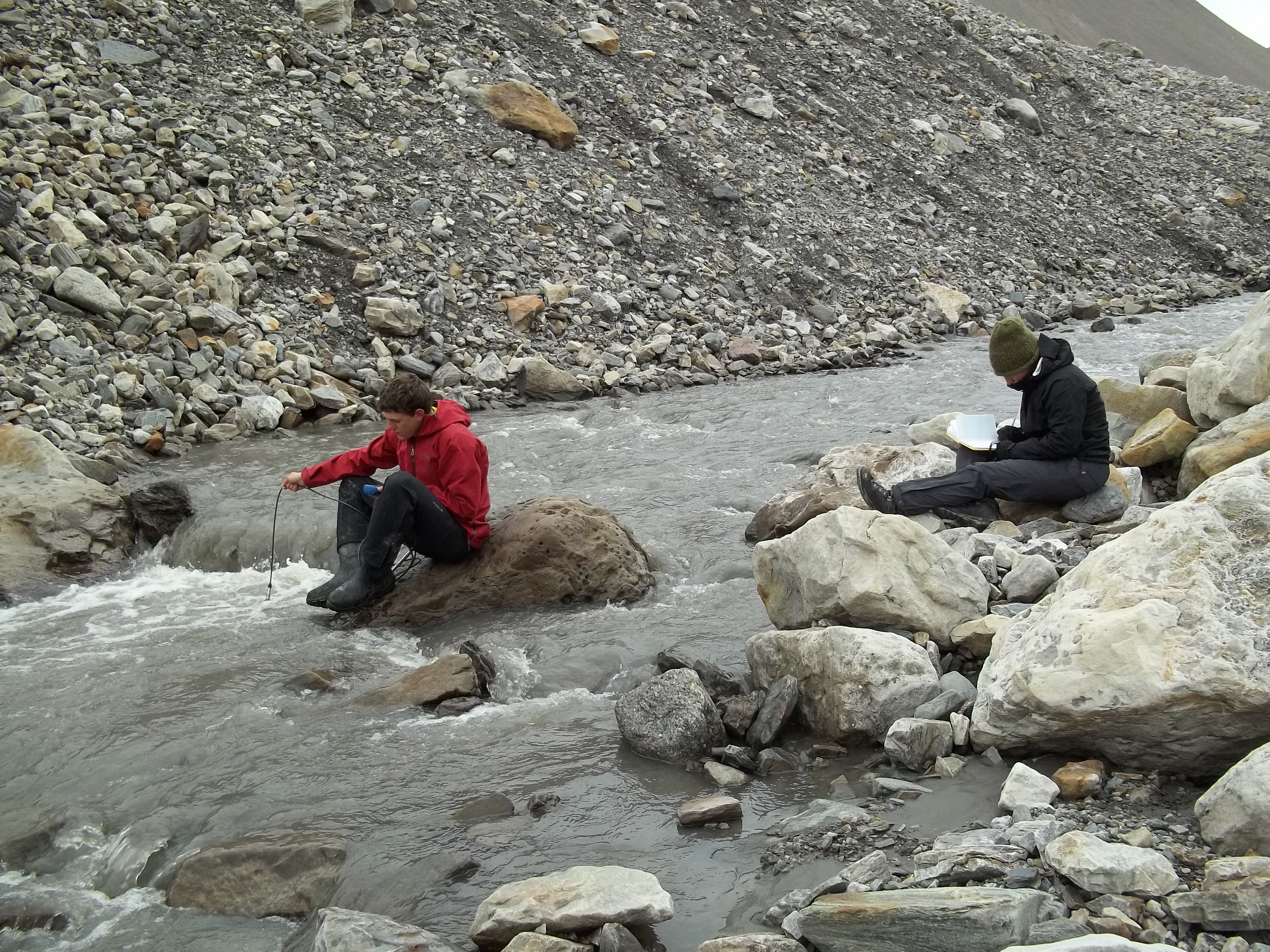 John Whiting and Kayla Nussbaum complete a salt discharge measurement. Isfjord Radio at Kapp Linne, Svalbard.