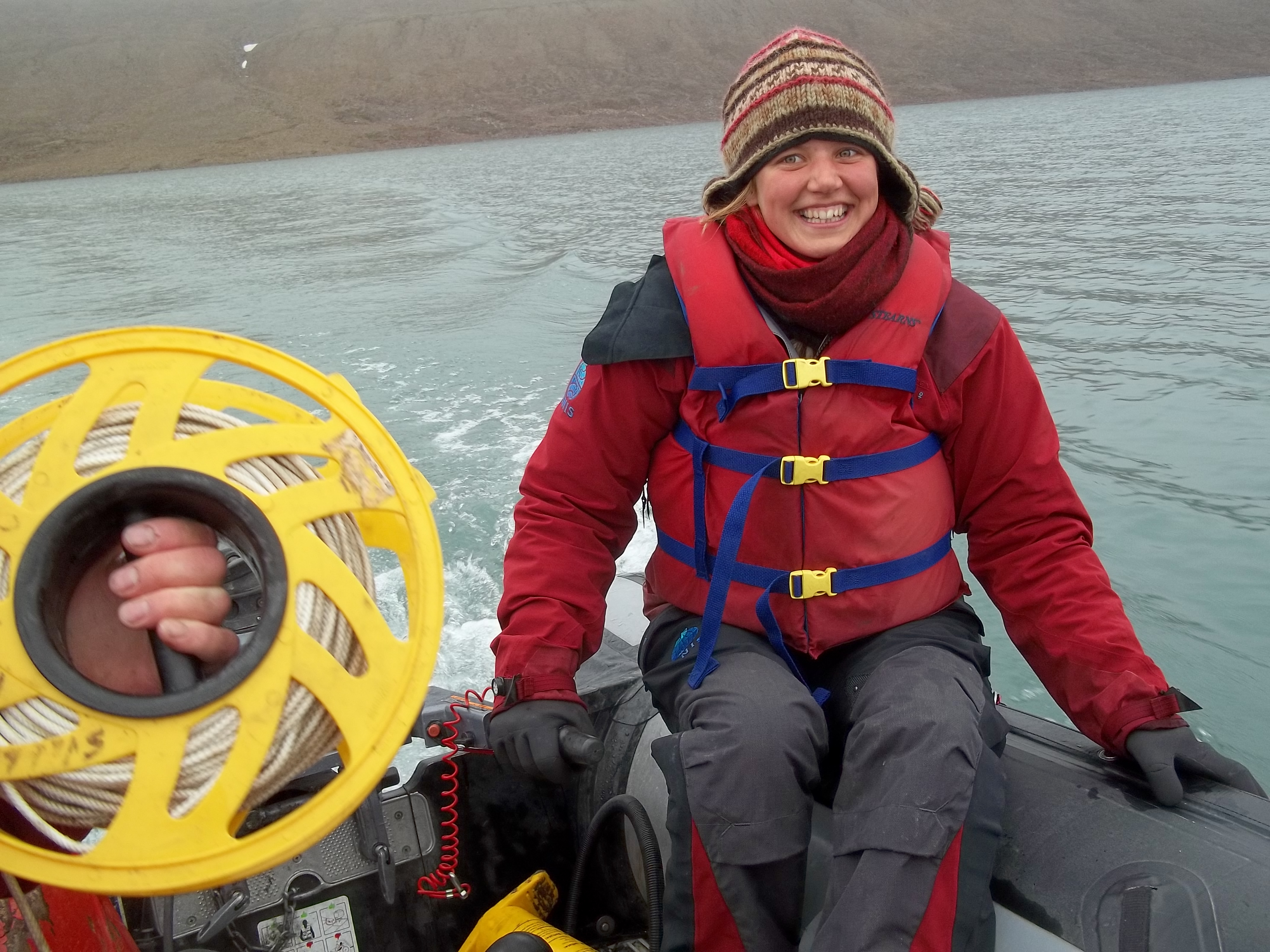 Dagmar Schou drives the boat for the first time on Lake Linne. Isfjord Radio at Kapp Linne, Svalbard.