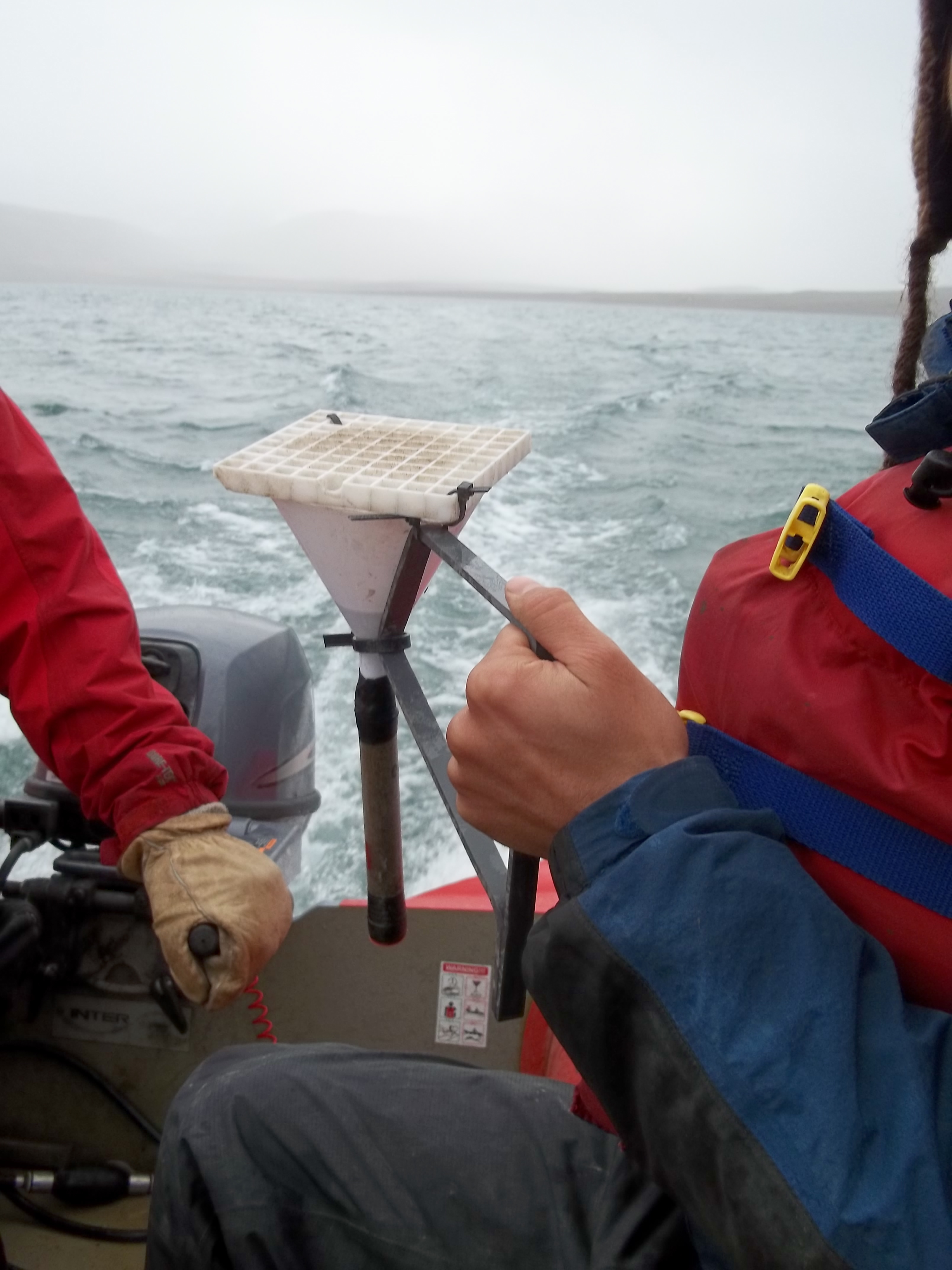 Dion Obermeyer holds a completely filled sediment trap. Isfjord Radio at Kapp Linne, Svalbard.