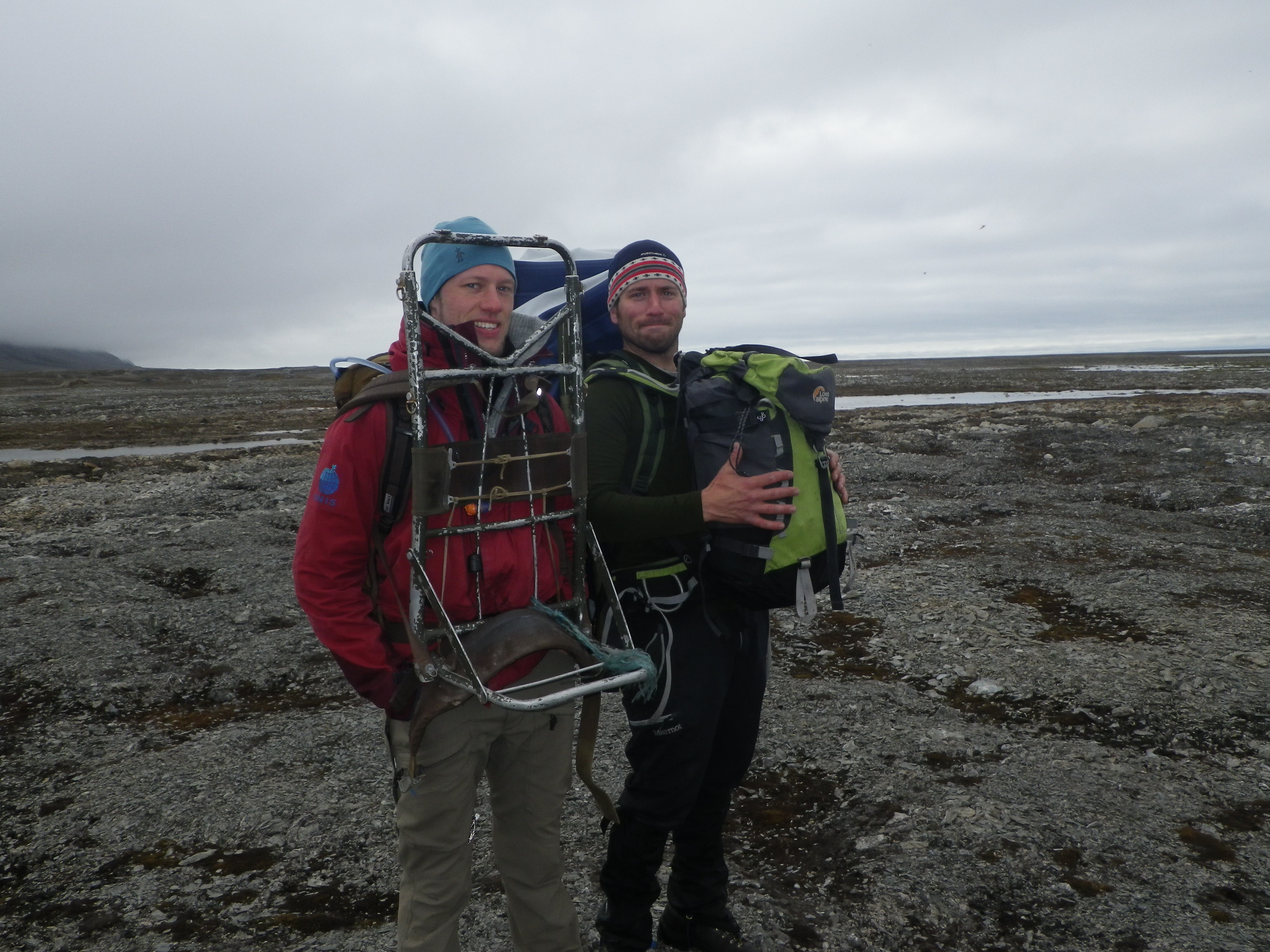 Lukas Glaw and Dan Frost are packed front and back with gear. Isfjord Radio at Kapp Linne, Svalbard.