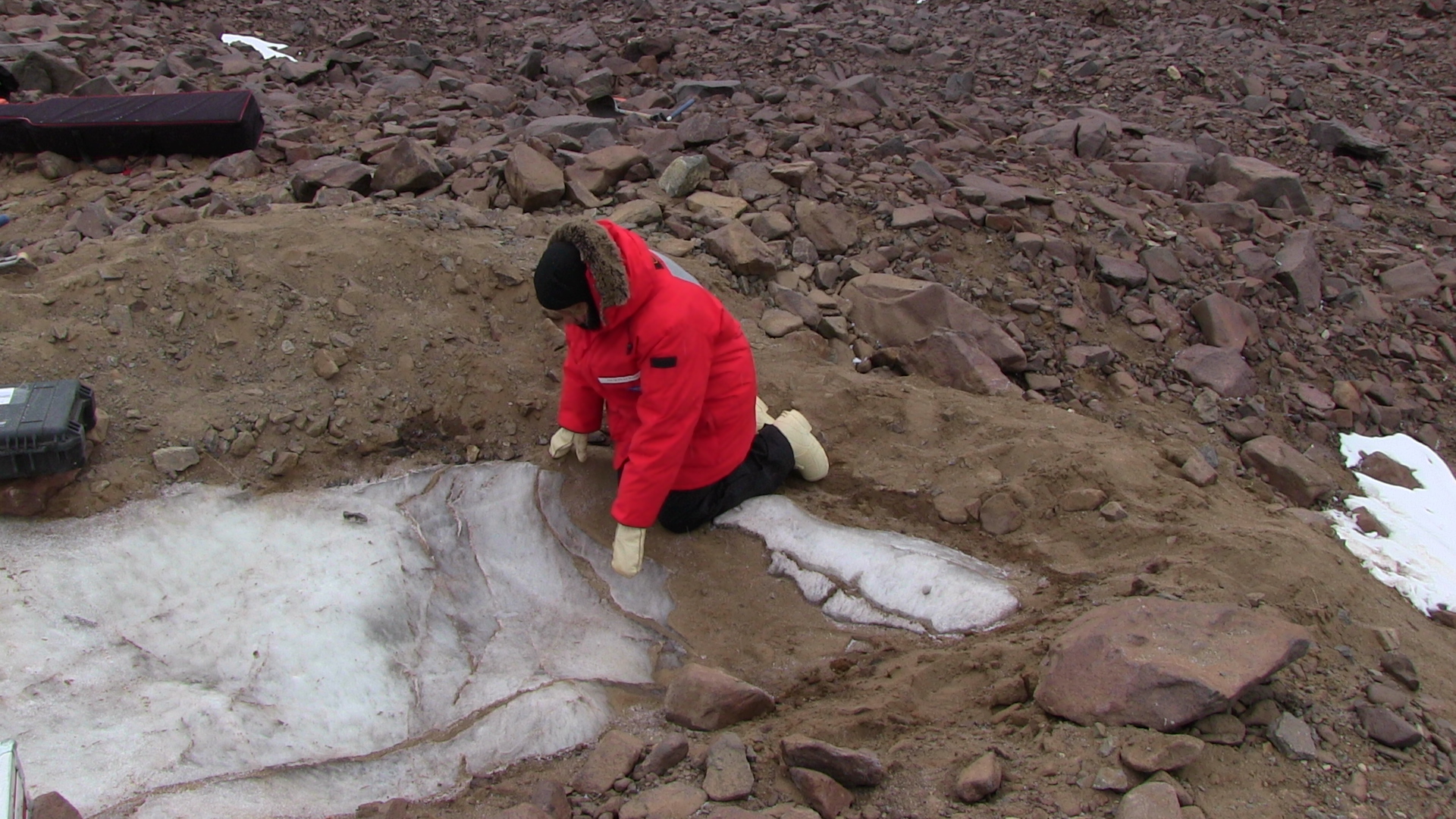 Jackie Hams examines a section of buried ice. Beacon Valley, Antarctica.