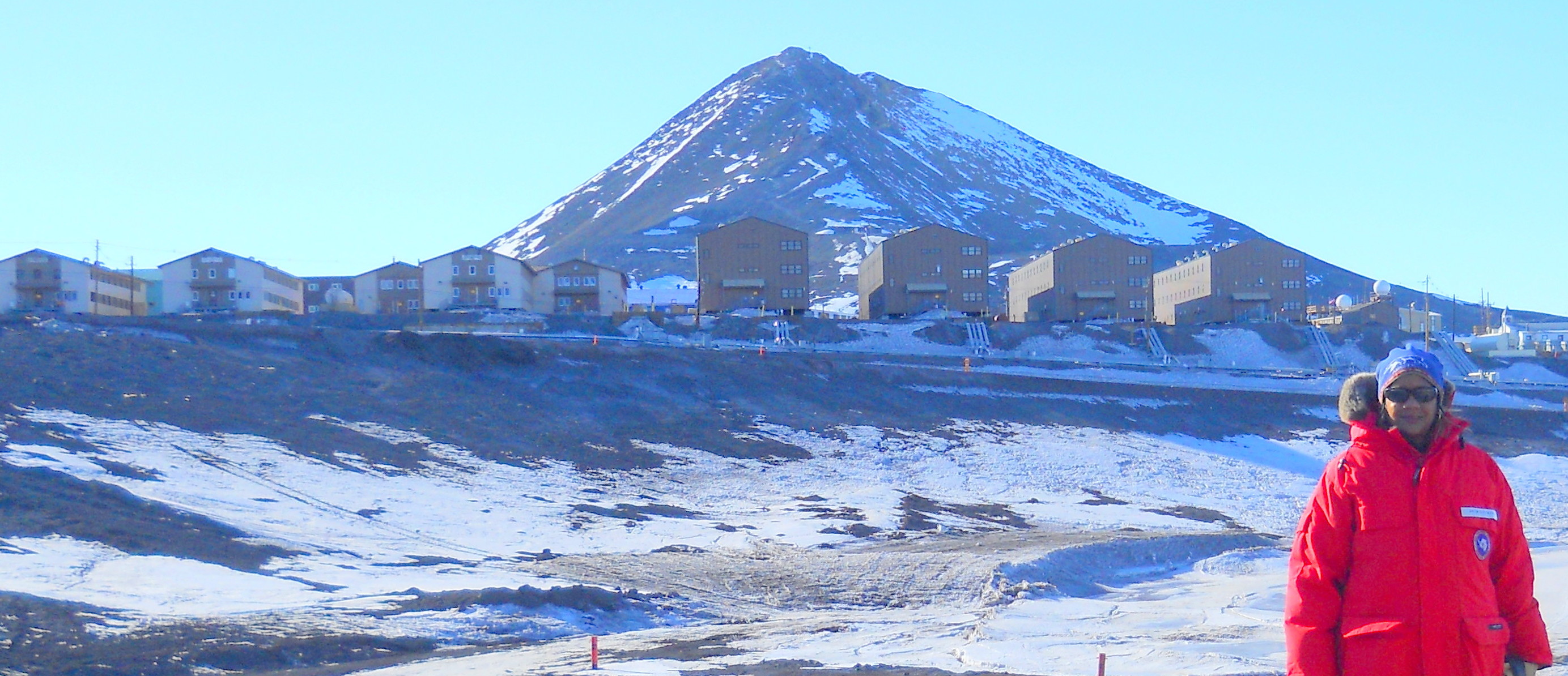 Jackie Hams and view of McMurdo Station, as seen from the Hut Point trail. McMurdo Station, Antarctica.