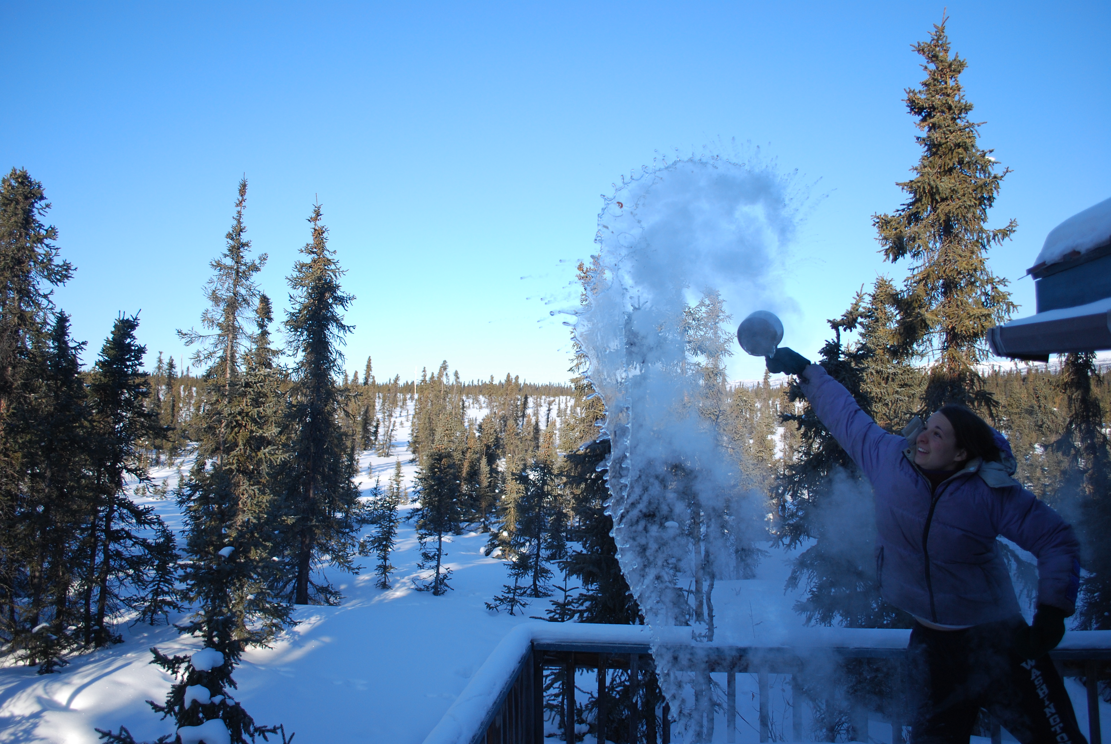 Elizabeth Webb throws boiling water into the air in -18 F temperature to see what happens. CiPEHR study site outside of Healy, Alaska.