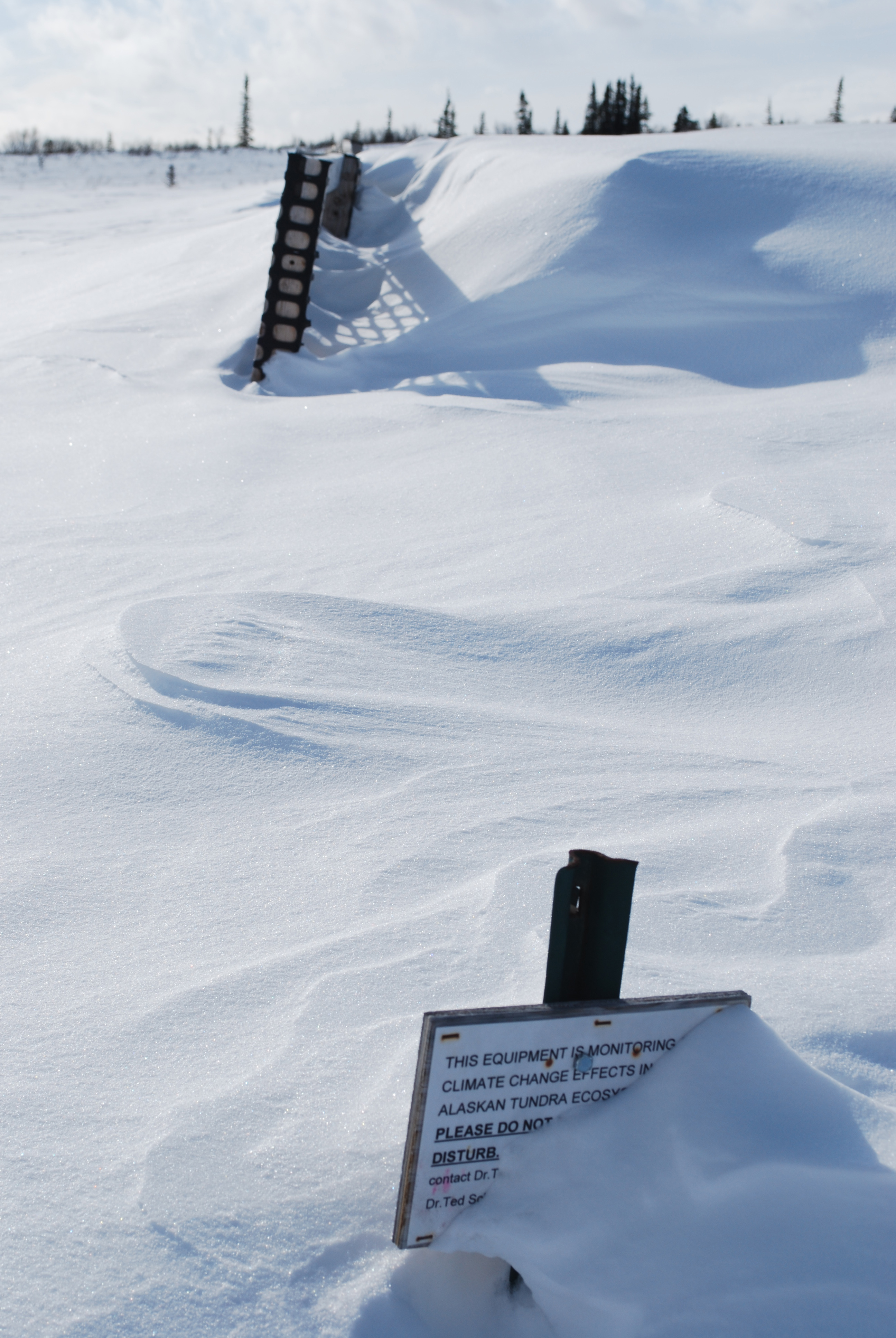 A close-up of snow fence with snow at Site B. CiPEHR study site outside of Healy, Alaska.