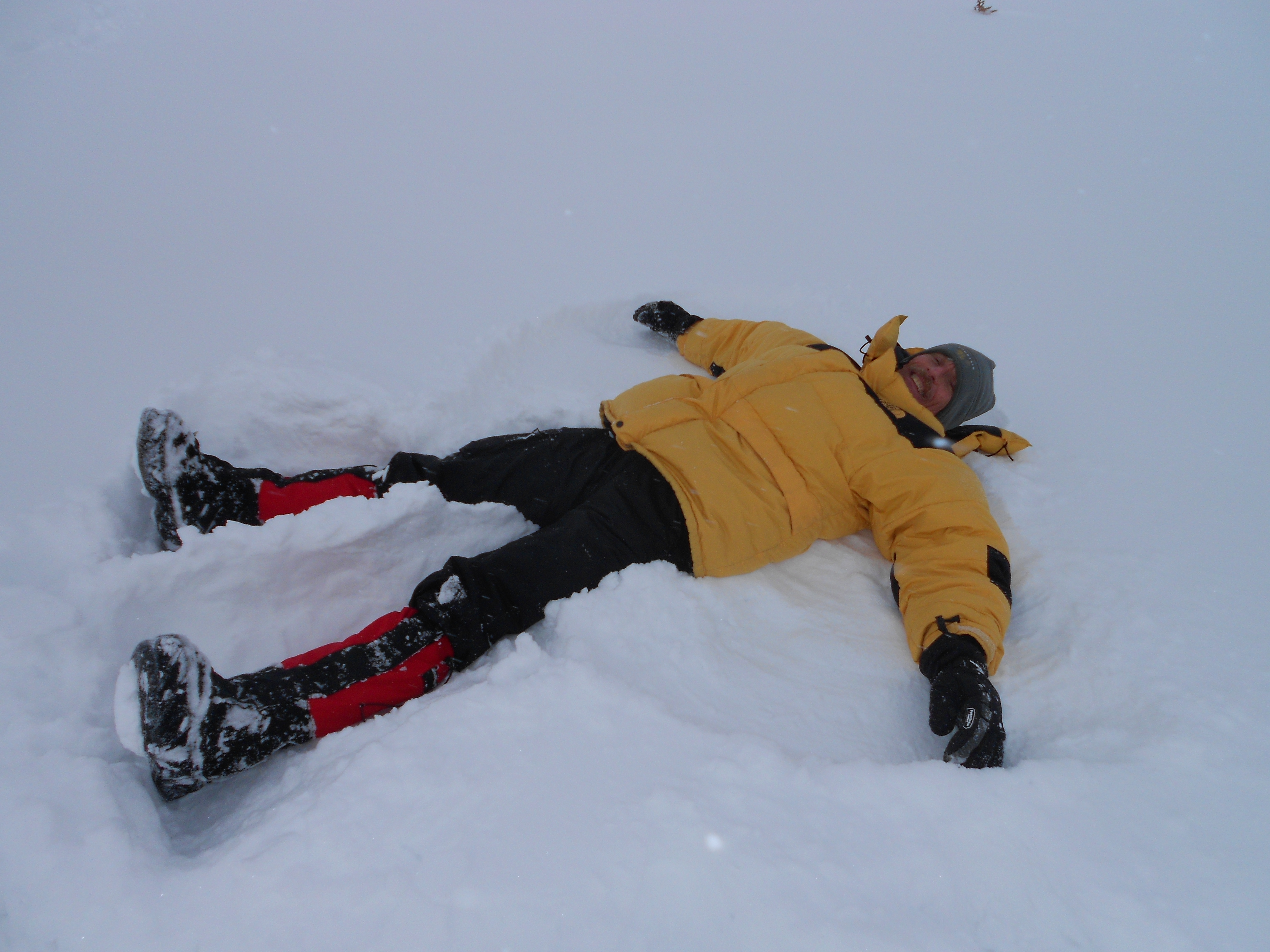 John Wood makes snow angels in the fresh snow. CiPEHR study site outside of Healy, Alaska.