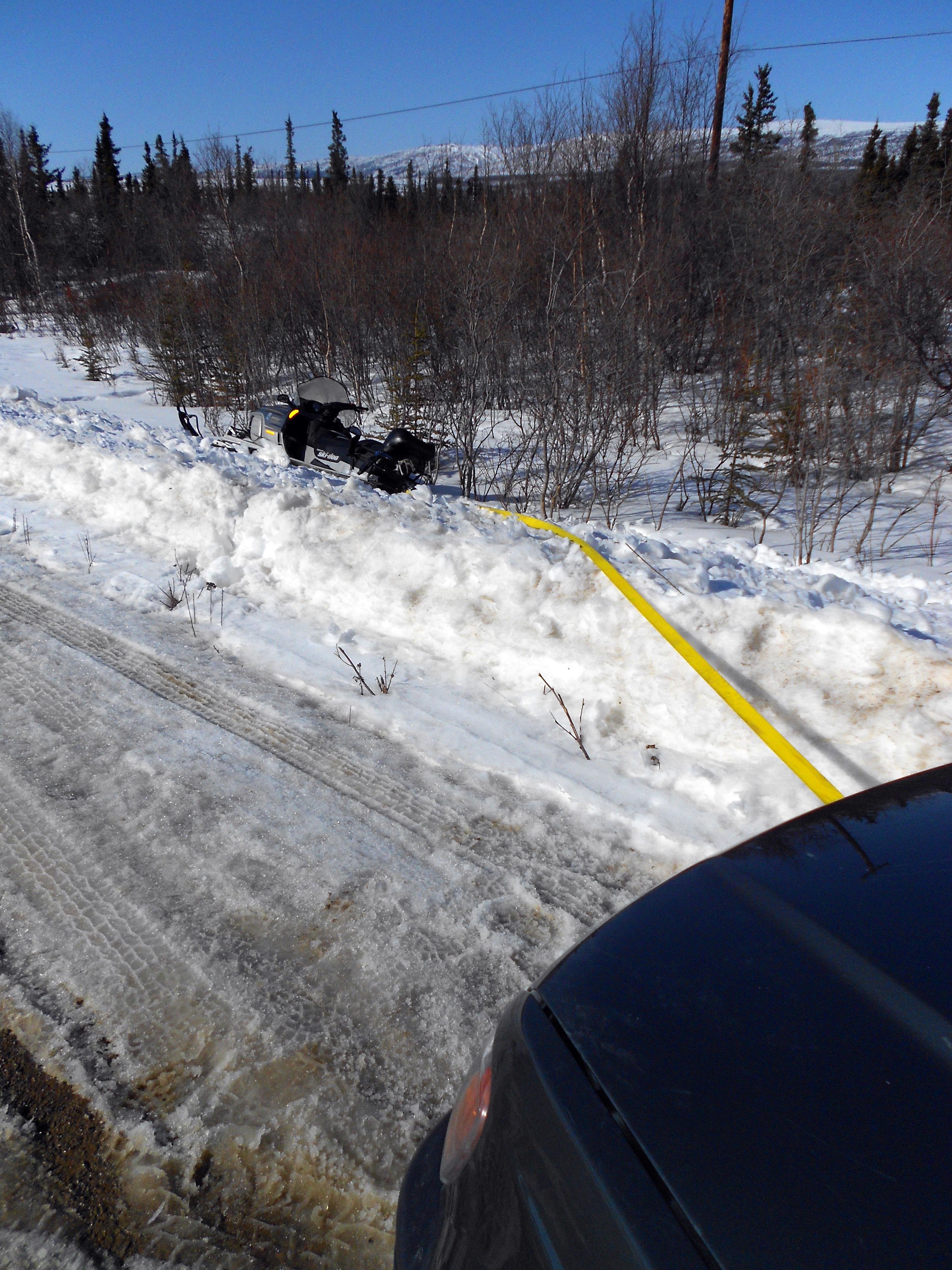 Elizabeth Webb uses the Jeep to pull the stuck snowmoblie out of the snow. CiPEHR study site outside of Healy, Alaska.