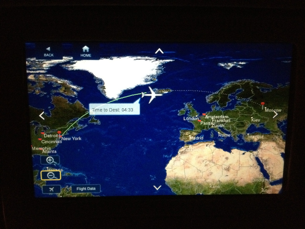 The arcing pathway of Mark Paricio's flight from New York to Moscow. In an airplane over the North Atlantic, near Iceland.