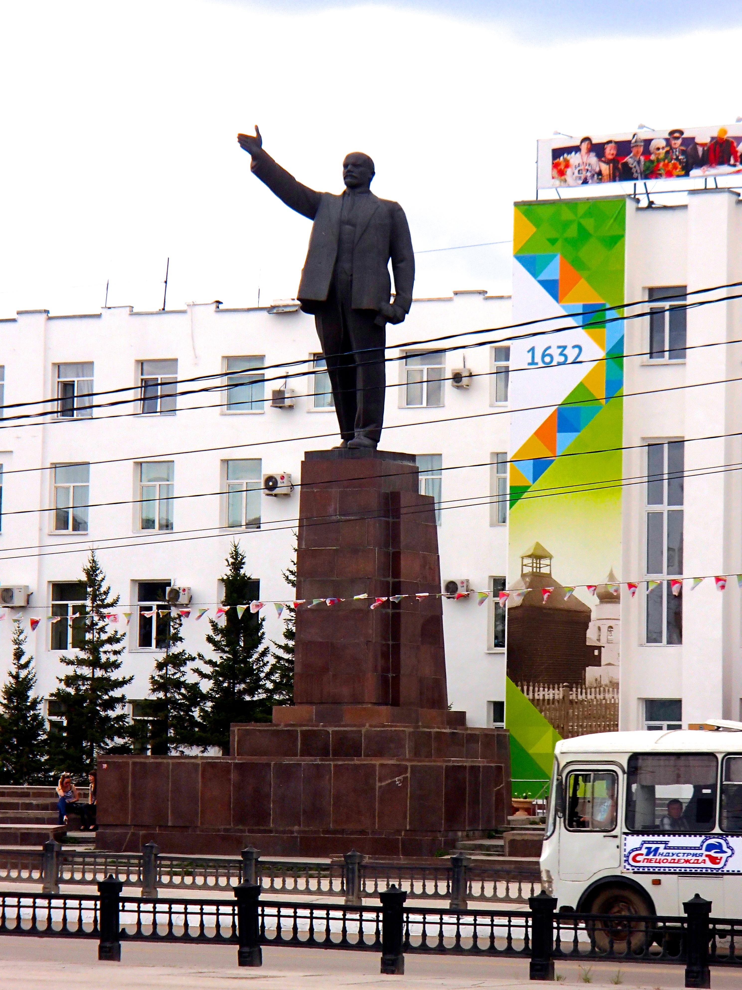 A statue of Lenin points the way north and to the team's destination. Yakutsk, Russia.