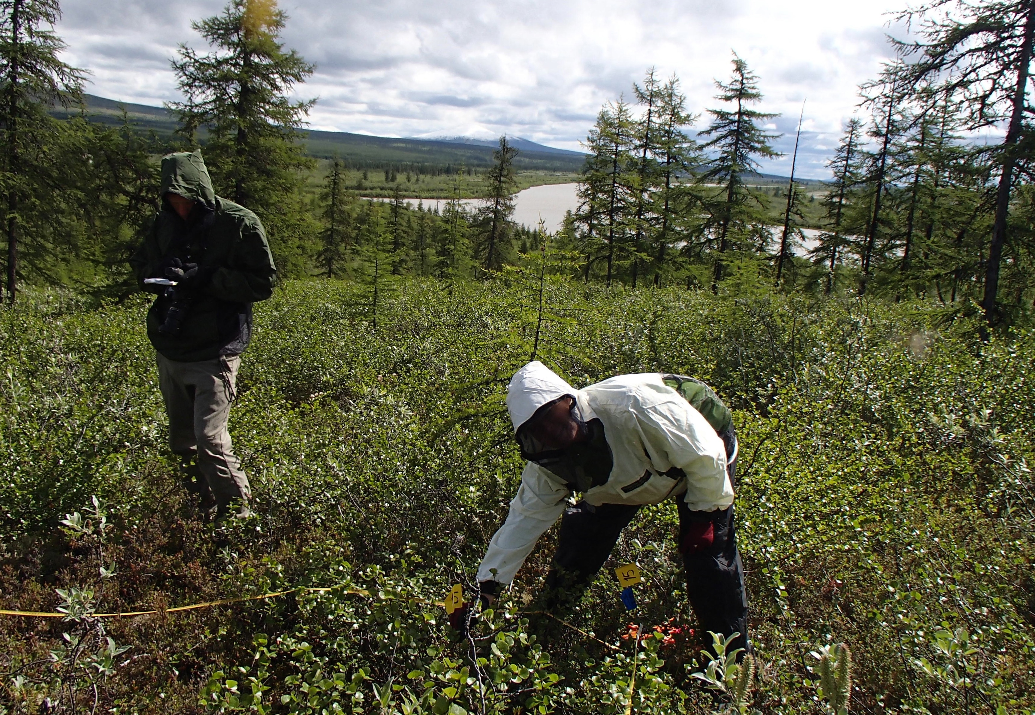 Dr. Heather Alexander places the last corner flag of Plot 15 while Logan Berner takes GPS measurements of its location. Cherskiy, Russia.