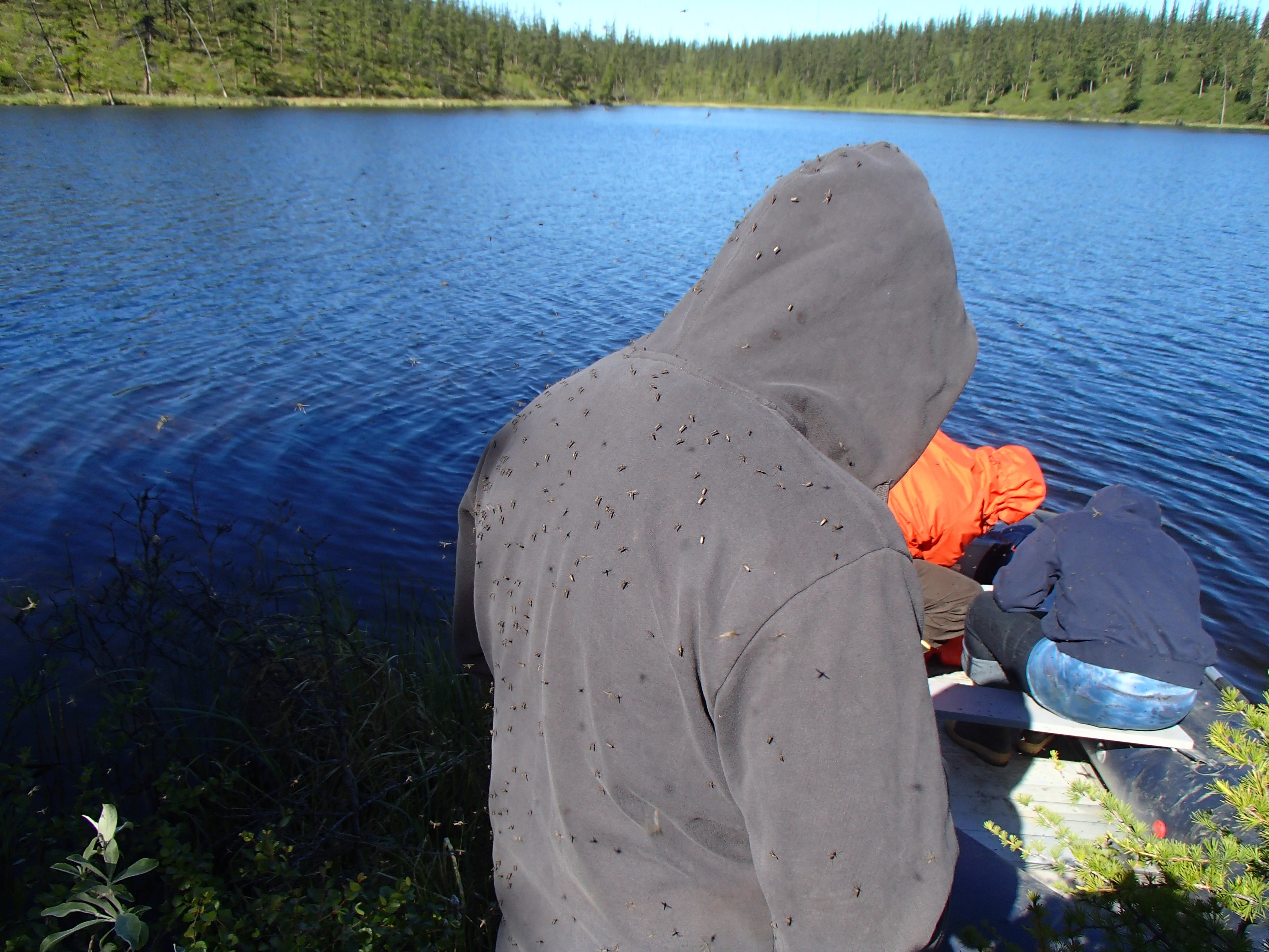 Alfonso Dominguez (Northern Arizona University) watches Sam Berman and Dr. Karen Frey (of Clark University) prepare a sampling raft on Shuch’ye Lake. Cherskiy, Russia.