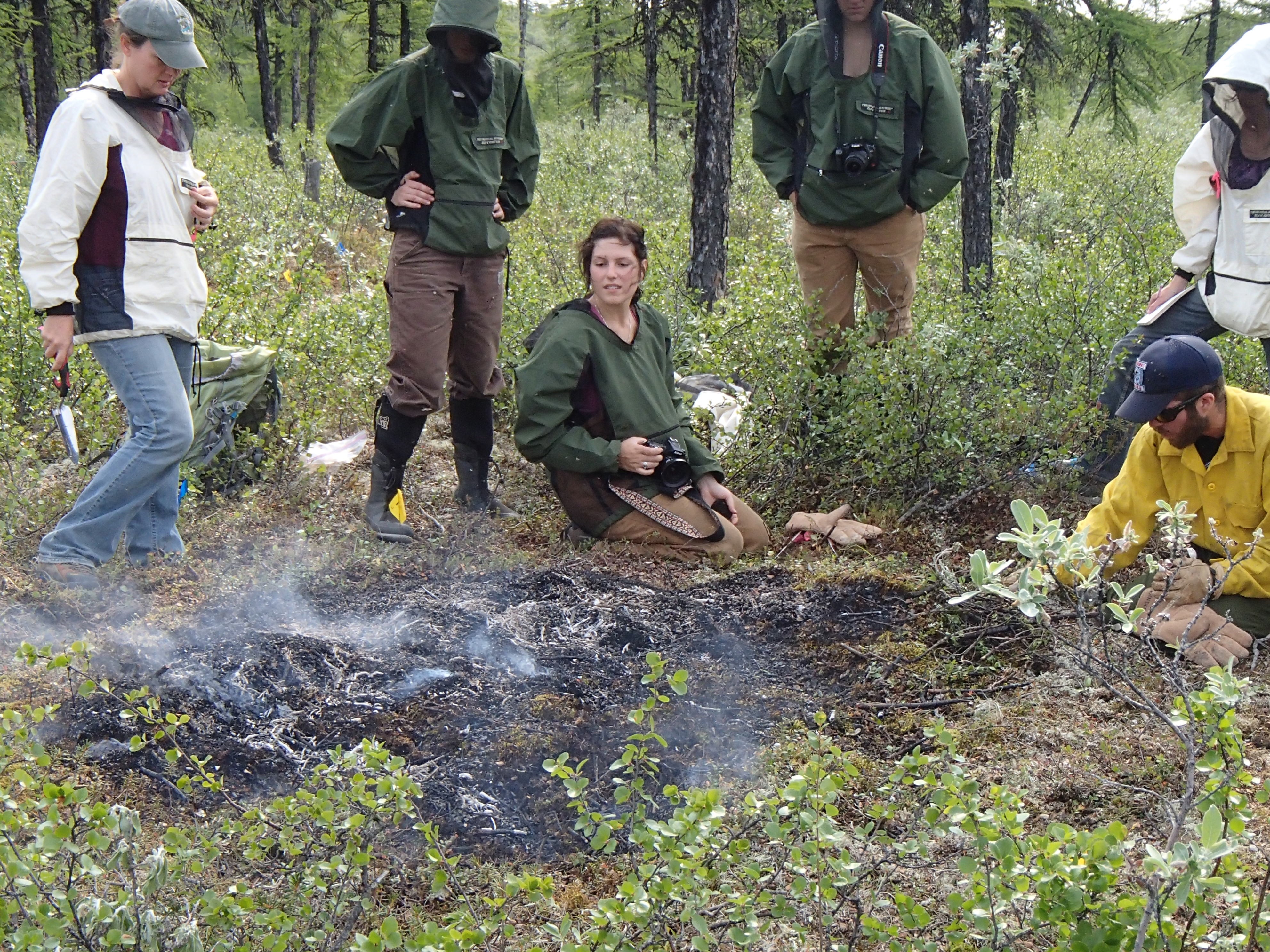Researchers keep an eye on one of the experimental burn plots as it smolders out. Cherskiy, Russia.