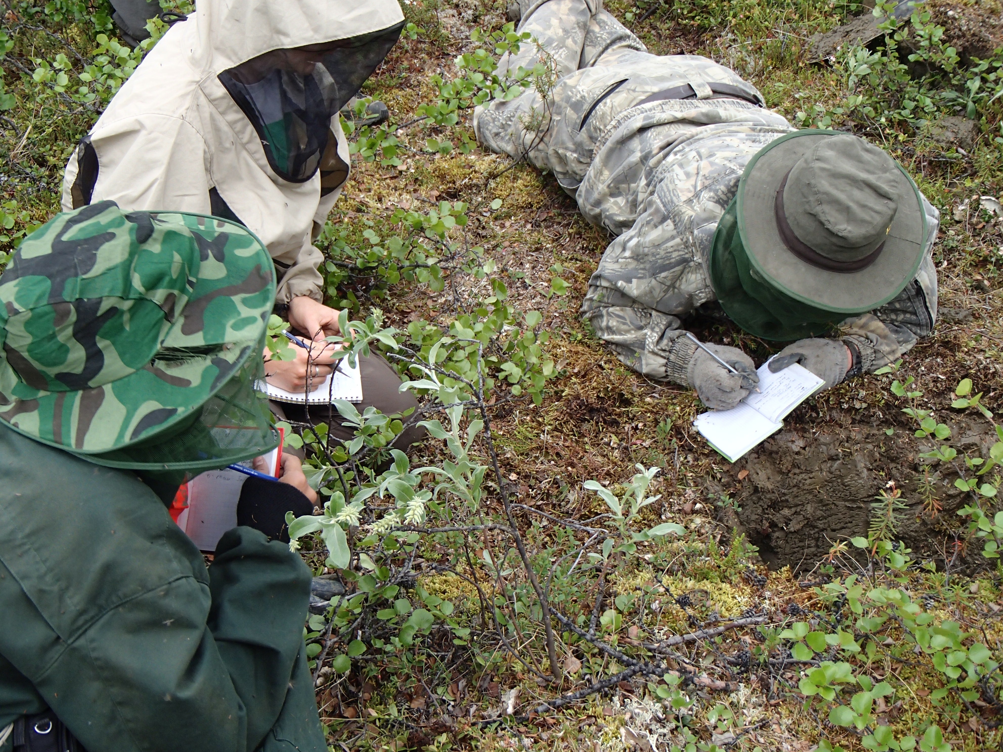 Varvara, Dylan, and Dr. Valentin Spektor (L to R) make observations of the permafrost pit. Valentin tutored the students on what observations were important. Numerous instruments were later added to make quantitative measurements. Cherskiy, Russia.