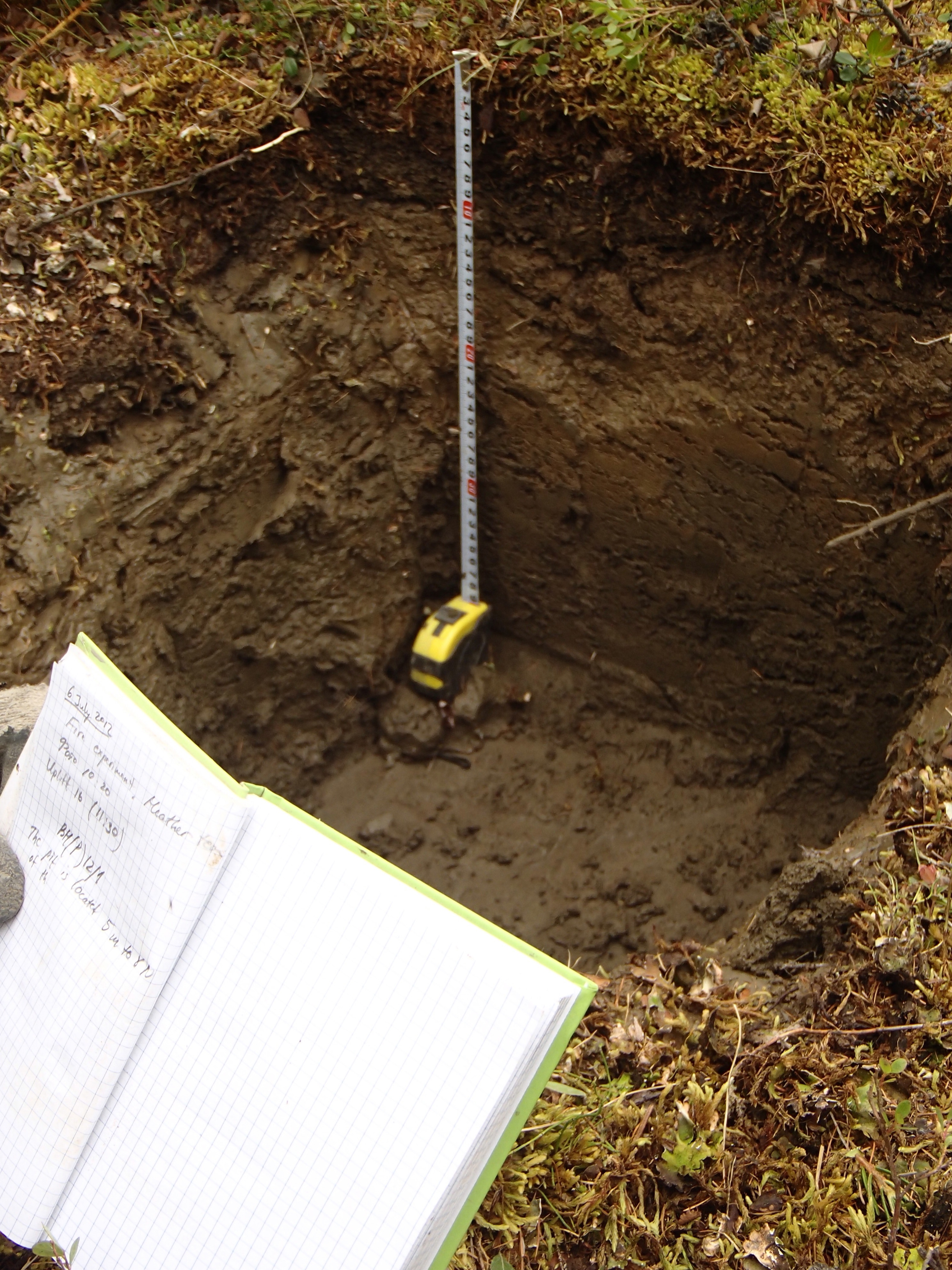 This is the team's first 45 cm-deep pit through the active layer of soil. Notice the flat floor of the pit where the permafrost begins. Also notice the depth of the moss layer. Cherskiy, Russia.