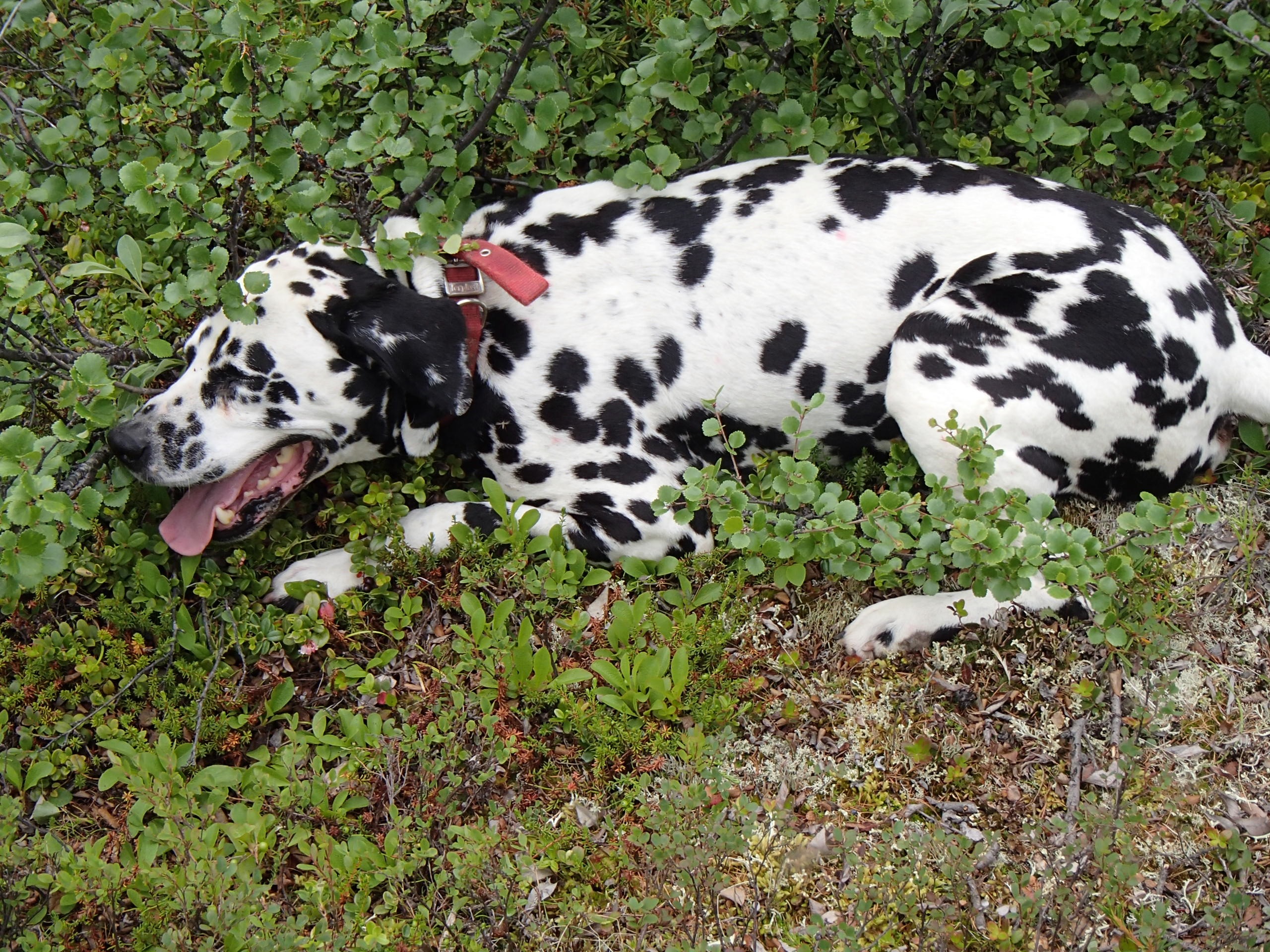 Mark Paricio: "Perhaps the northern most dalmation in the world, Nelson, escapes the mosquitos under a dwarf birch bush." Cherskiy, Russia.