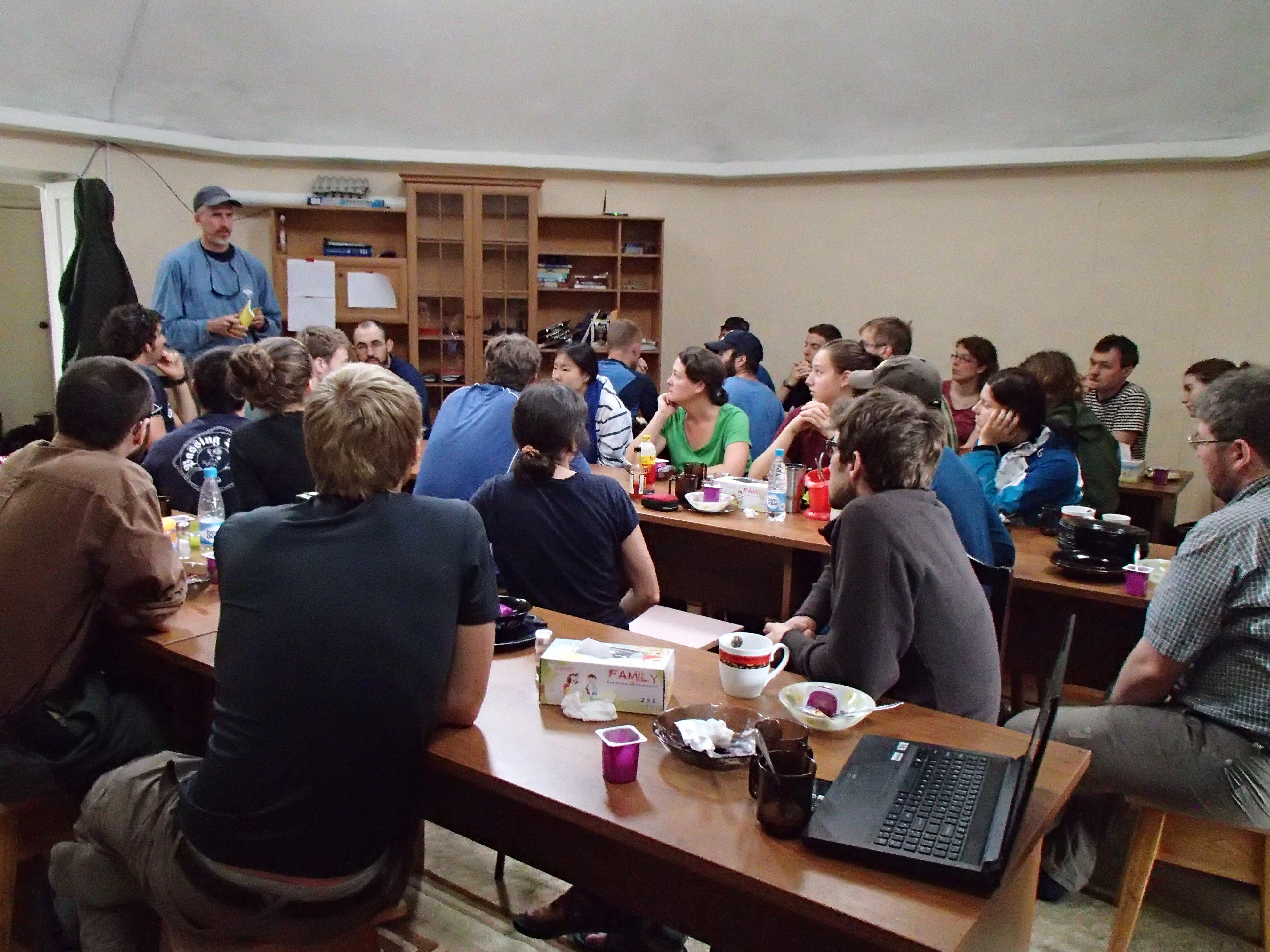 Max Holmes leads an after-breakfast debriefing to cover the agenda for the day. Cherskiy, Russia.