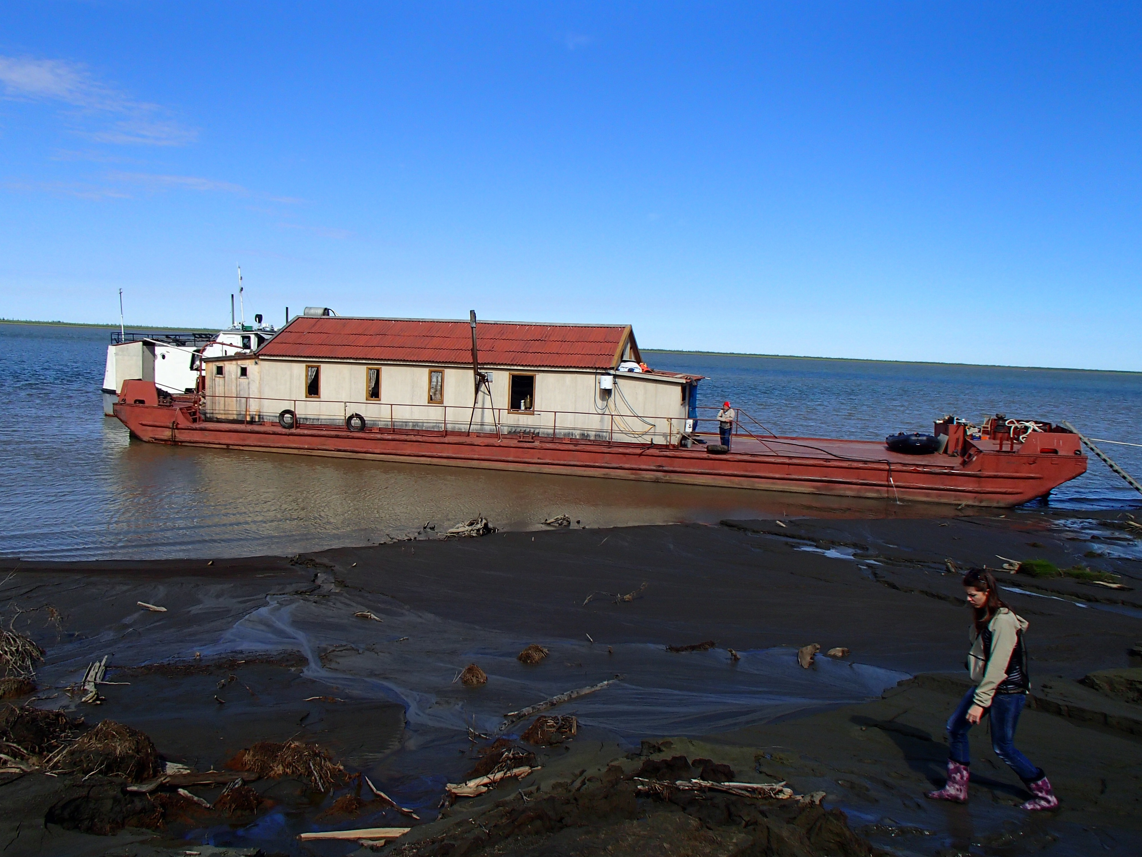 Nastya Zimova, of the Northeast Science Station, steps quickly across the mud flats to avoid sinking. The team's mobile home, The Barge, is in the background. Duvanny Yar, Russia.