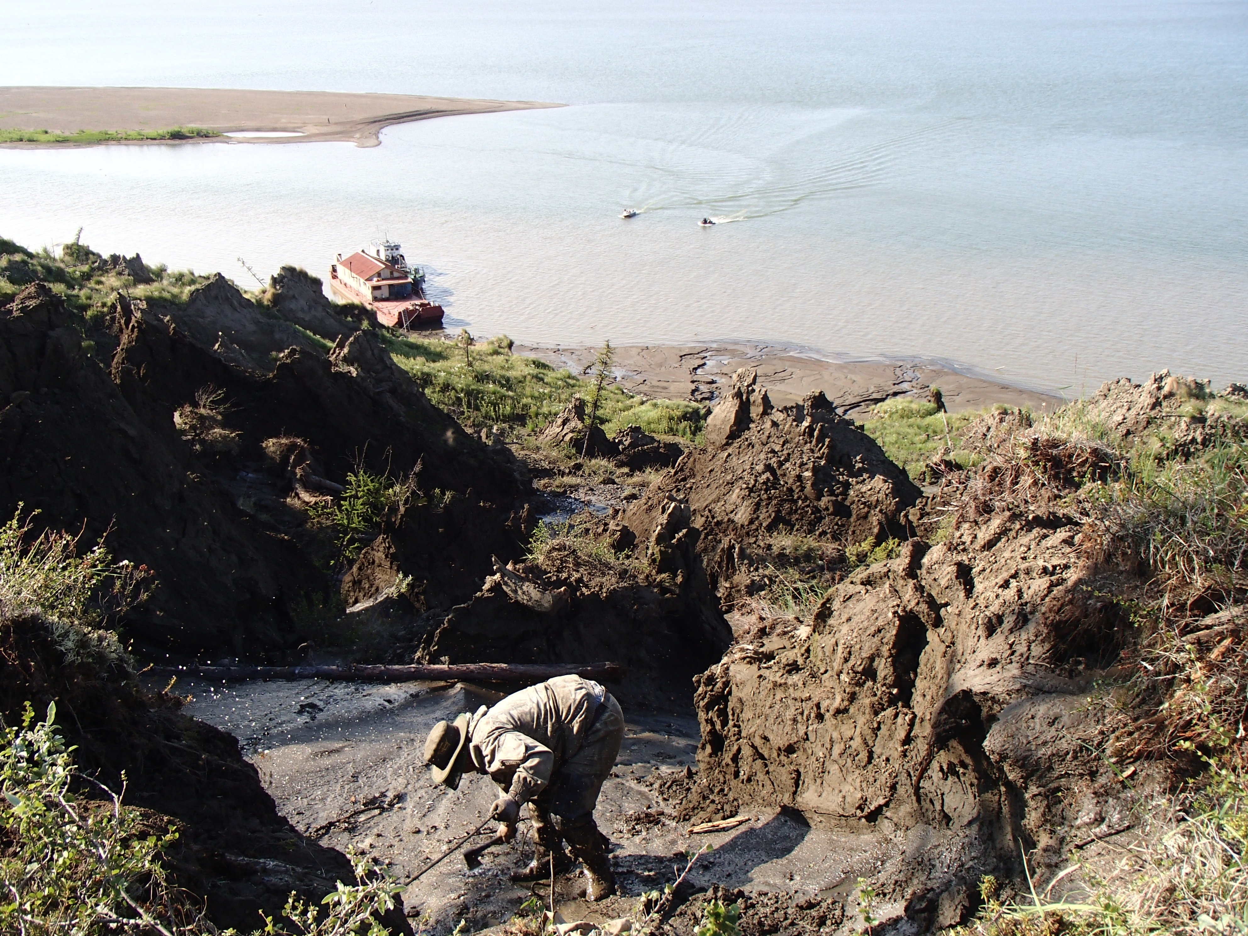 Dr. Valentin Spektor uses his axe to carve out a step on the exposed ice wedges of Duvanny Yar from which to take samples. Below him, two of the speedboats are returning from making aquatic measurements. Duvanny Yar, Russia.