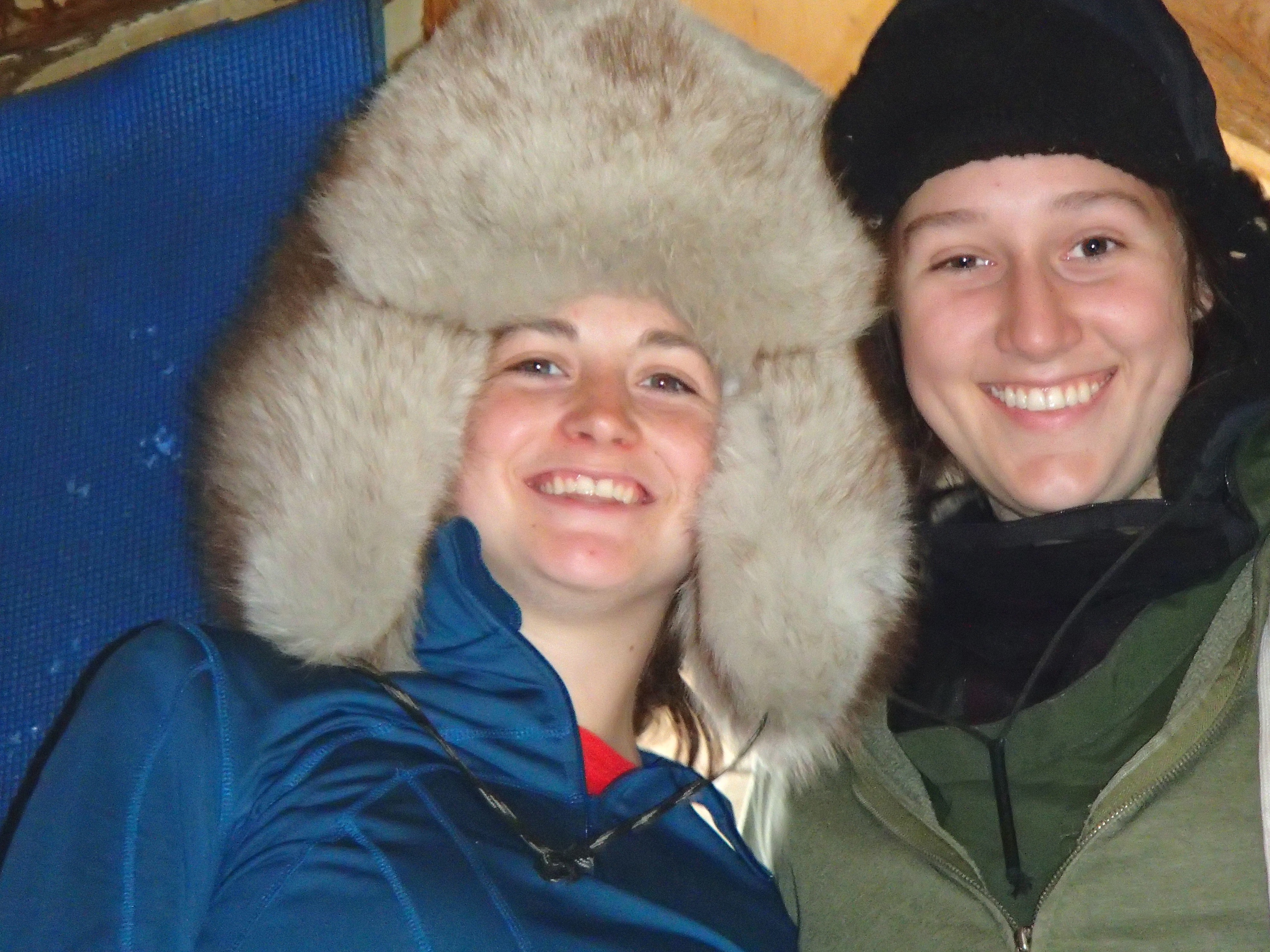 Dylan Broderick (Clark University) and Lindsey Parkinson (Western Washington) wear winter fur hats during a field excursion to Pleistocene Park. At Pleistocene Park, south of Cherskiy, Russia.