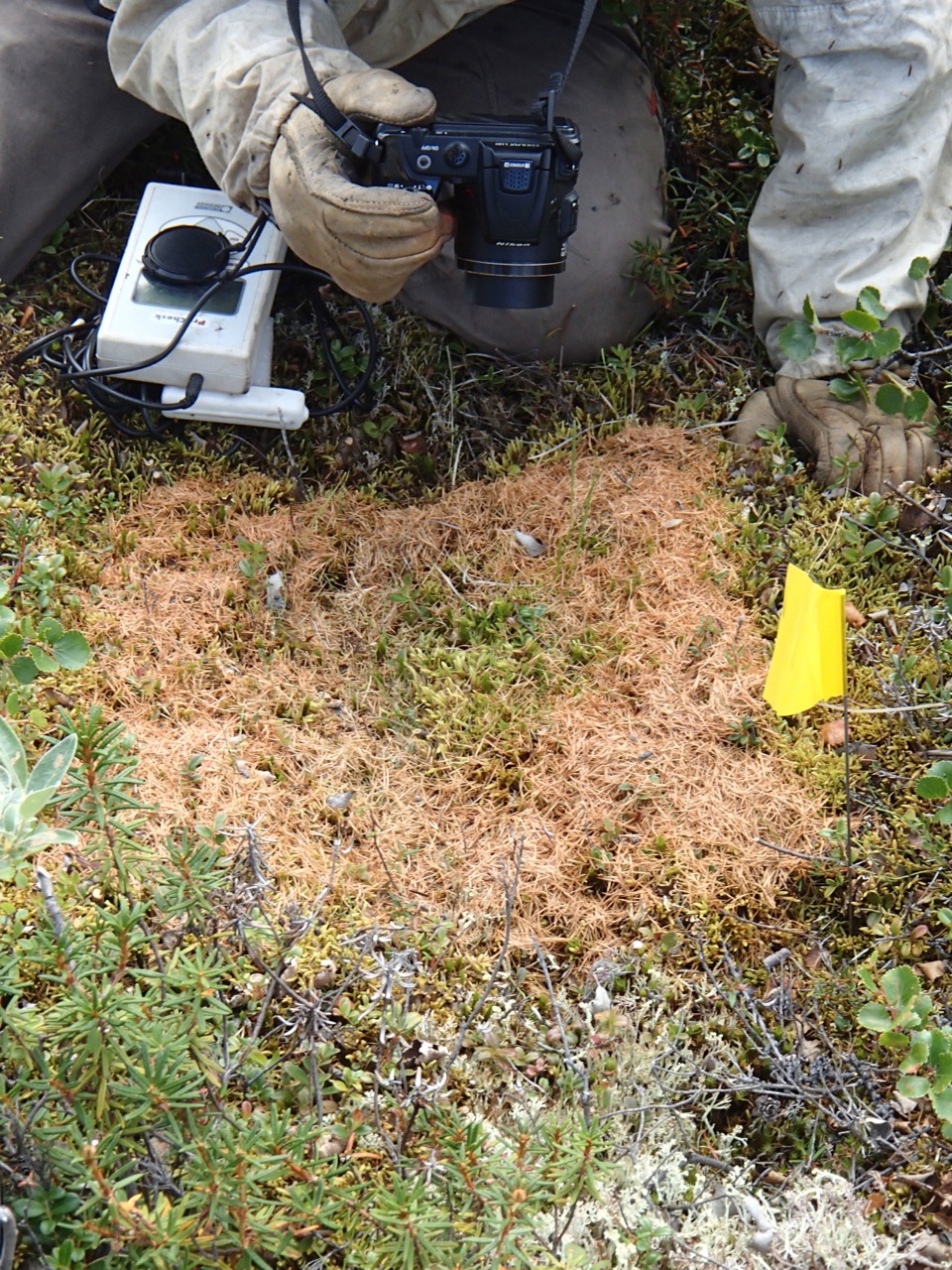 Peter Ganzlin (University of Florida) takes a close-up photograph to document the effect of heavy larch litter on a moss plot. Cherskiy, Russia.
