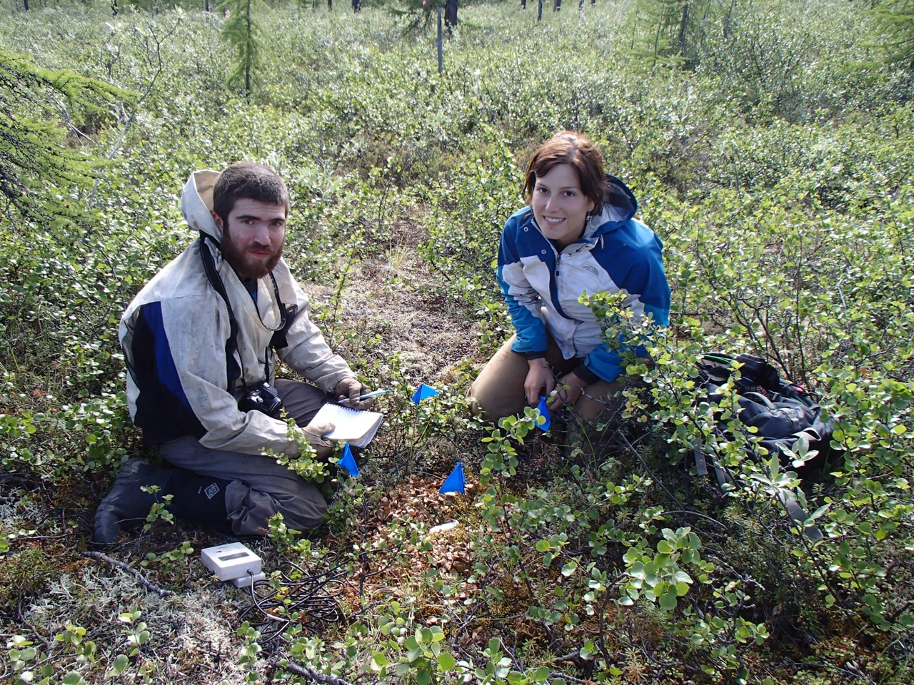 Peter Ganzlin and Brandi Jo Petronio at one of their 20 moss plots outlined by the four blue flags. Cherskiy, Russia.