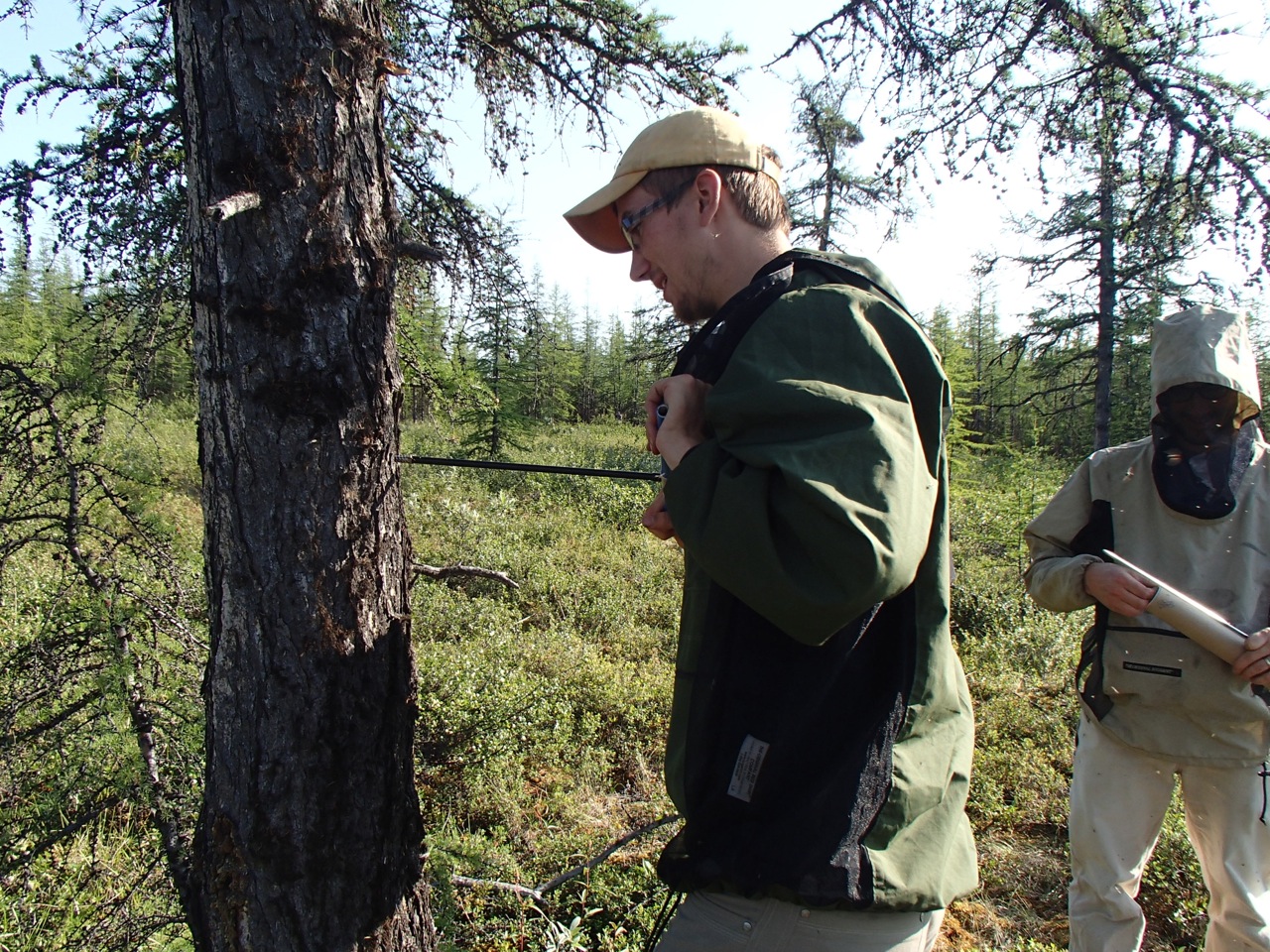 Seth Spawn (St. Olaf College) takes a core from a very old larch tree. Cherskiy, Russia.