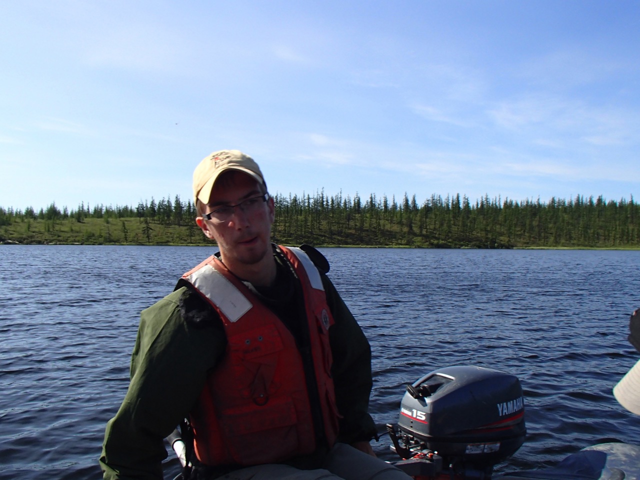 Seth Spawn guides the team's raft out to the sampling area on Shuch’ye Lake. Cherskiy, Russia.