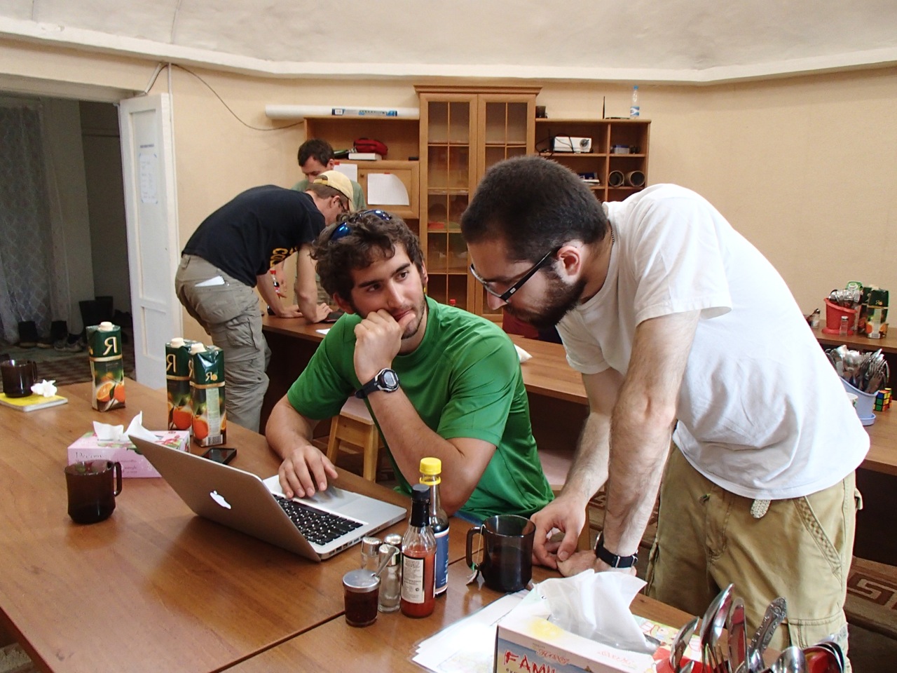 Clark University graduate student Dave Mayer helps Clark undergraduate Sam Berman understand the units of microeinsteins per square meter. Cherskiy, Russia.
