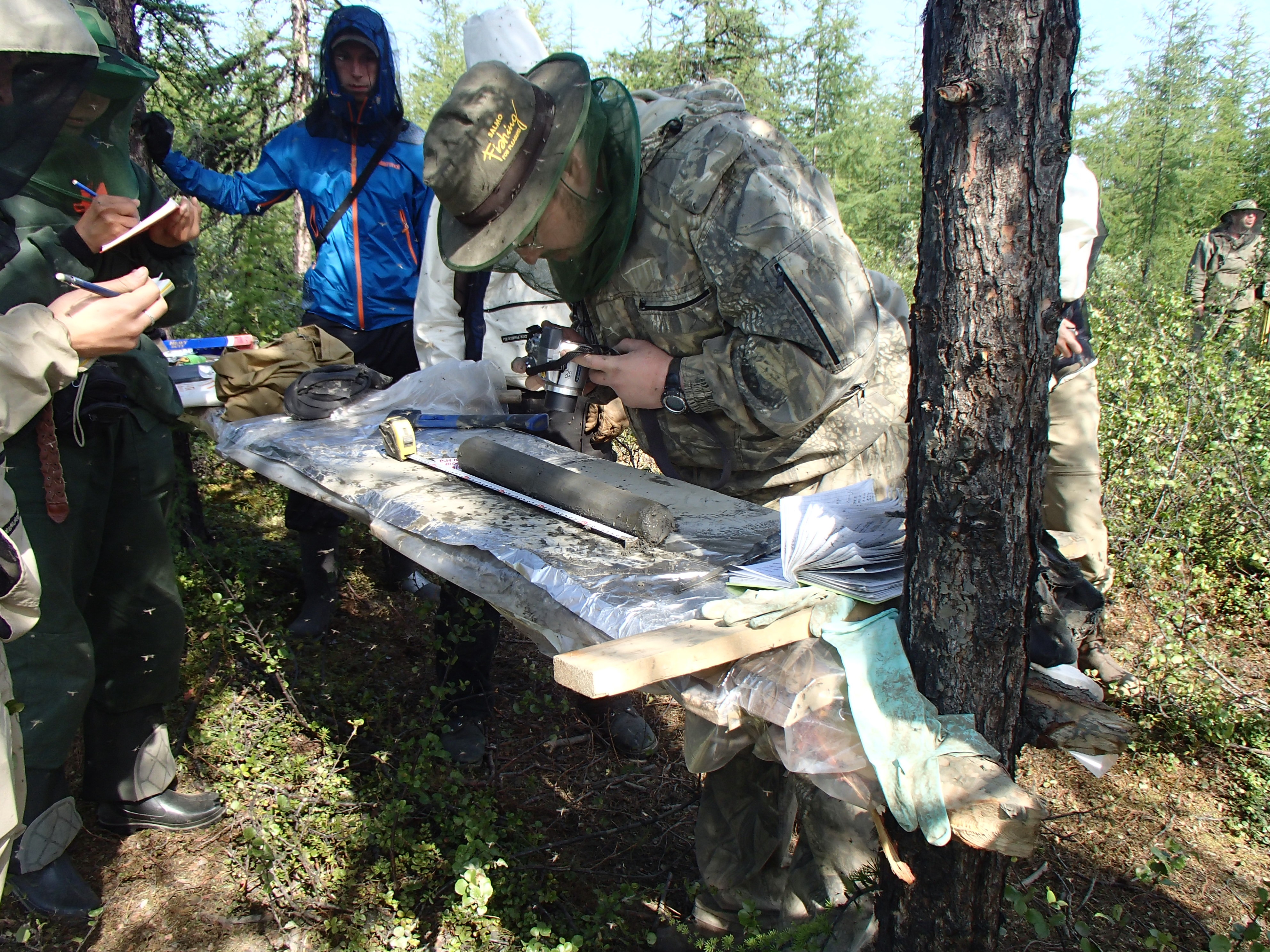 Dr. Valentin Spektor uses his camera to make a photographic record of the micro-inclusions in the permafrost core. Field assistants Varvara Andreeva and Dylan Broderick make notes in their field books. Cherskiy, Russia.
