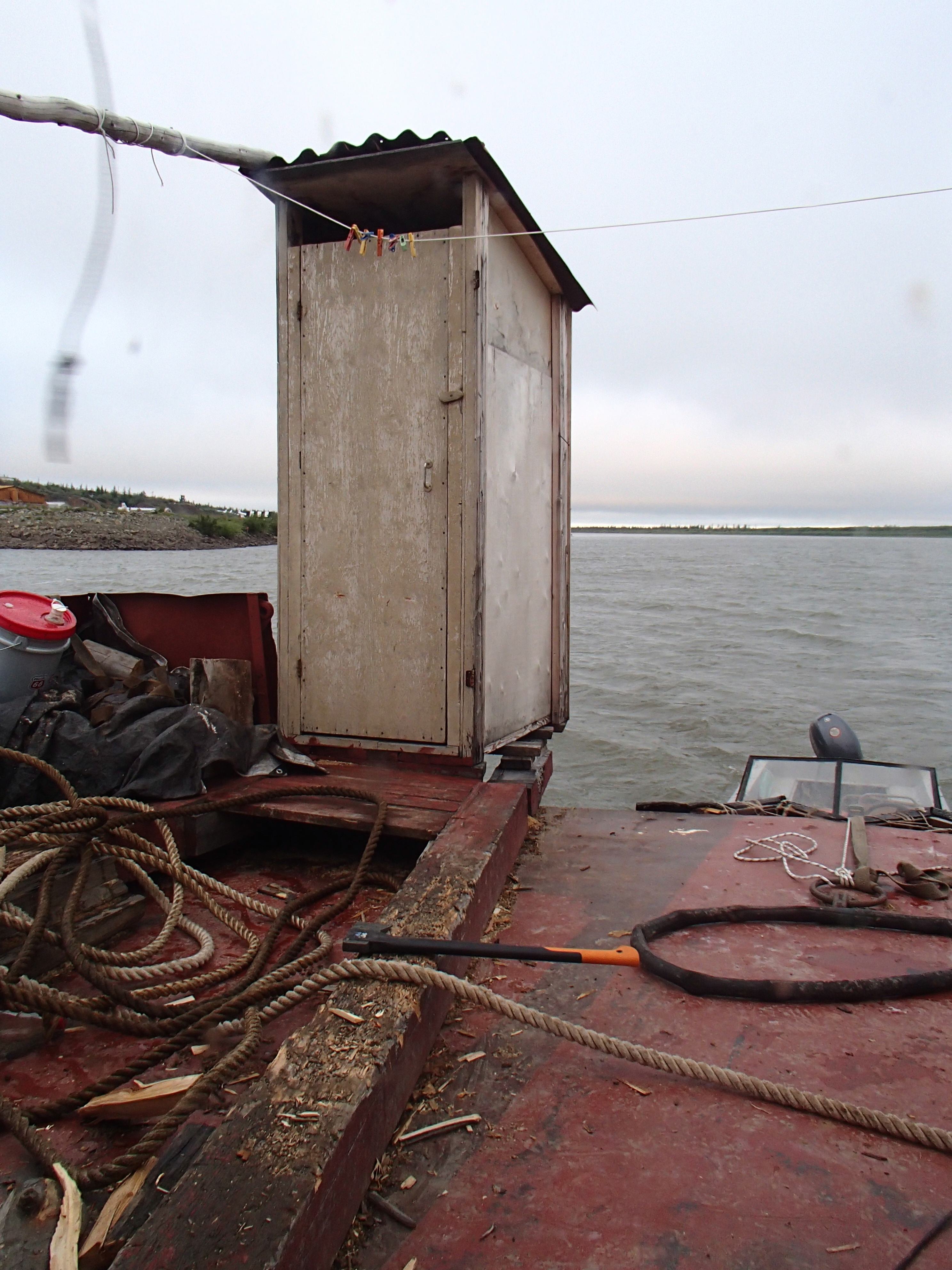 Mark Paricio: "The outhouse (#1 only) overhangs the river off the barge. Not for the weak of heart in rough weather." Cherskiy, Russia.