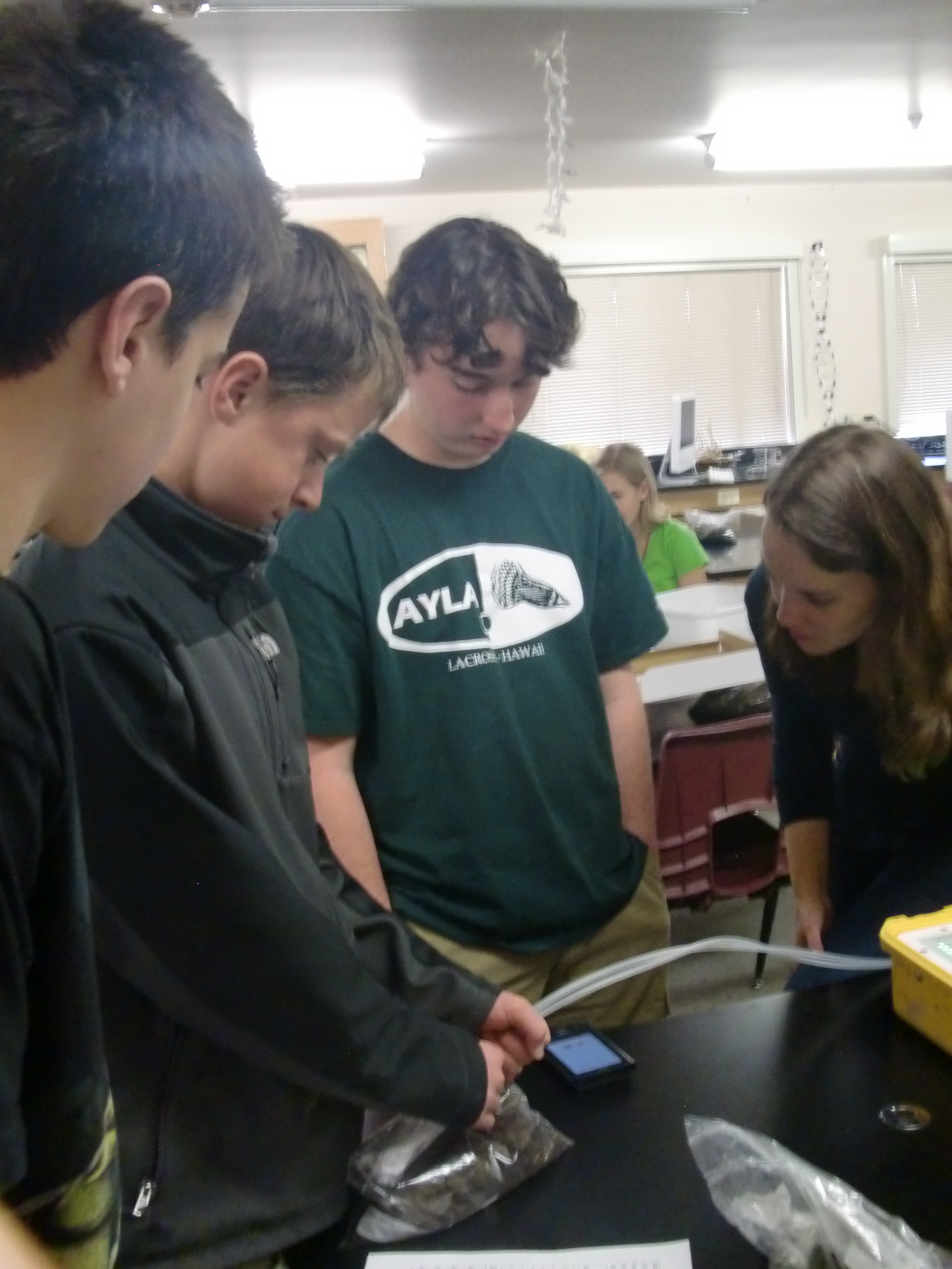 Students test the CO2 flux from their bag of soil. Alexander Dawson School, Lafayette, Colorado.