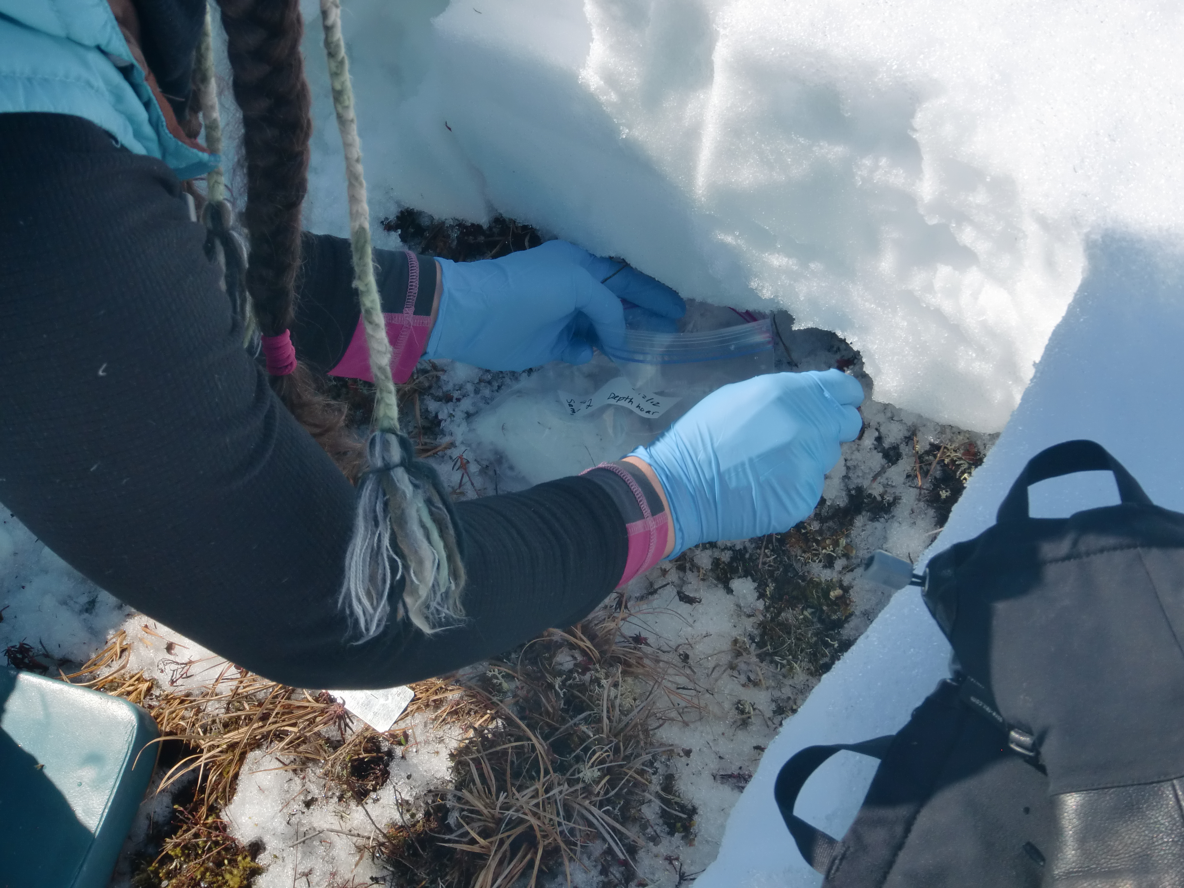 Molly Tedesche takes a depth hoar snow sample. In the Kuparuk River Valley near Toolik Field Station, Alaska.