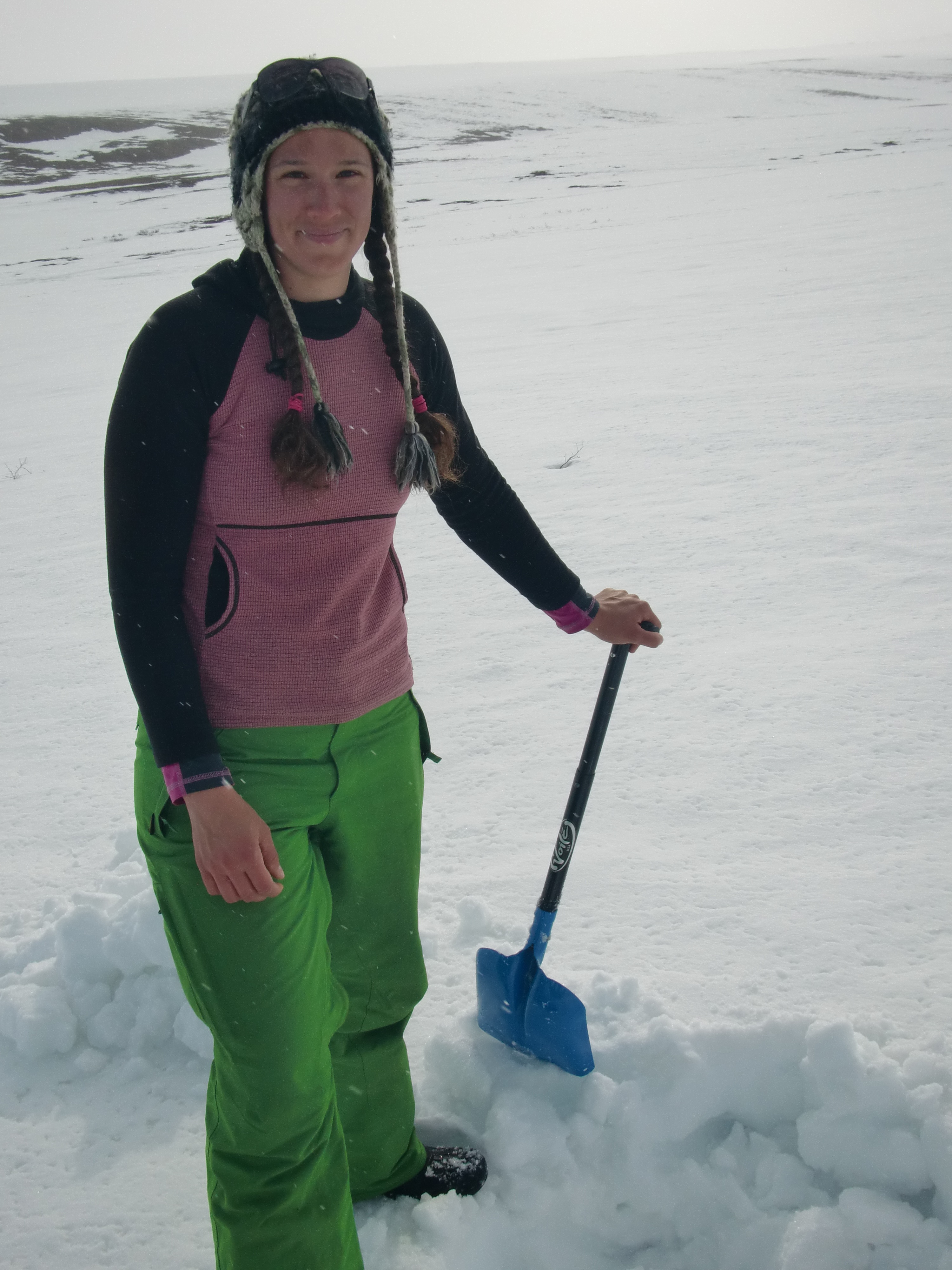 Molly Tedesche works on digging a snow pit in the water track. In the Kuparuk River Valley near Toolik Field Station, Alaska.